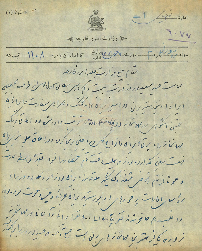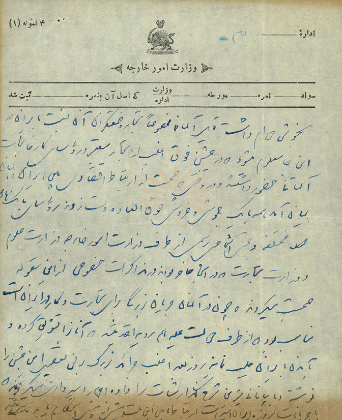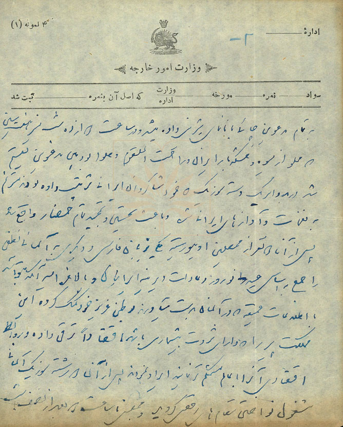 شرح: این سند گزارش ادارة سوم سیاسی وزارت امورخارجه از برگزاری جشن نوروز توسط دانشجویان ایرانی دانشگاه برلن آلمان با کمک سفارت ایران در یکی از بهترین مهمانخانههای برلن است. در این جشن که بیش از 500 ایرانی و آلمانی اعم از وکلاء، وزراء، روسای ادارهها، استادان دانشگاه، مدیران جراید و کارخانهها و بانکها و تجار حضور داشتهاند، علاوه برپایی هفت سین و پذیرایی با شیرینی ها و خوراکی های ایران و همچنین آوازخوانی و ابراز شادی در مورد نوروز و روابط آلمان و ایران، سخنرانی هایی به فارسی و آلمانی انجام شده و روز بعد جراید بزرگ برلن از این جشن به تفصیل نوشتهاند.