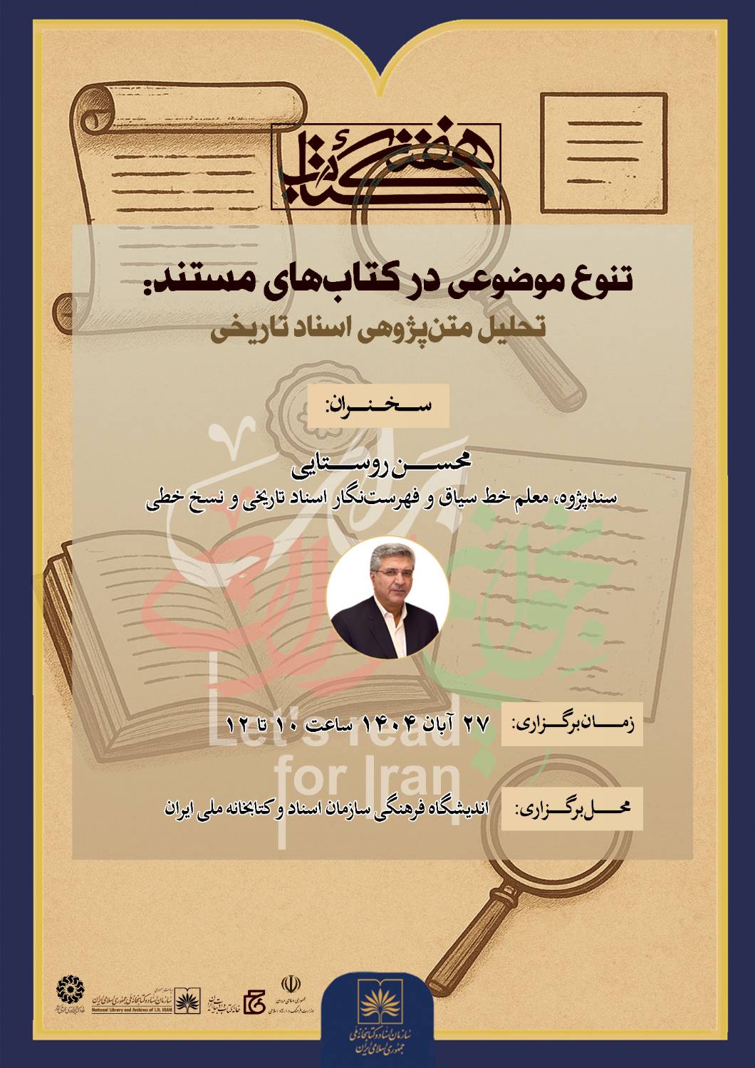 نشست «تنوع موضوعی در کتابهای مستند» روز ۲۷ آبان در اندیشگاه فرهنگی سازمان اسناد و کتابخانه ملی ایران با سخنرانی محسن روستایی برگزار میشود.