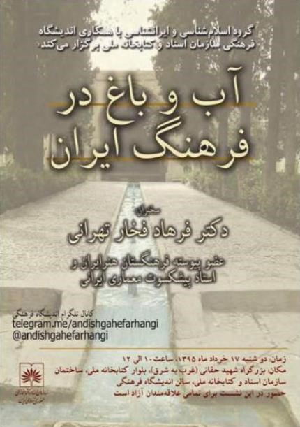 سومین جلسه نشست گروه پژوهش های اسلام شناسی و ایران شناسی تحت عنوان «آب و باغ در فرهنگ ایران» با سخنرانی دکتر فرهاد فخار تهرانی، استاد پیش کسوت معماری ایرانی و عضو پیوسته فرهنگستان هنر ایران در 95/3/17 در اندیشگاه فرهنگی برگزار شد.