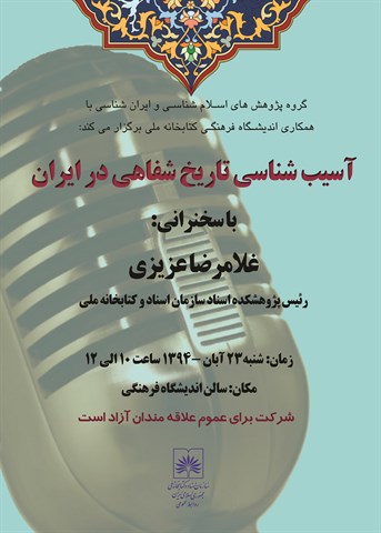نهمین نشست گروه پژوهش های اسلام شناسی و ایران شناسی سازمان اسناد و کتابخانه ملی در سال 94 با عنوان « آسیب شناسی تاریخ شفاهی در ایران » با حضور غلامرضا عزیزی، رئیس پژوهشکده اسناد و جمعی از علاقه مندان این حوزه در اندیشگاه فرهنگی کتابخانه ملی برگزار شد.