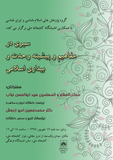 نشست تخصصی با عنوان  «سیری در مفاهیم و پیشینه وحدت و بیداری اسلامی» روز سه شنبه 17 شهریور ماه 94 با سخنرانی دکتر محمدحسین ­امیر اردوش، محقق و پژوهشگر تاریخ و رایزن فرهنگی پیشین ایران در تاجیکستان، در اندیشگاه سازمان اسناد و کتابخانه ملی ج.ا.ا. برگزار شد.