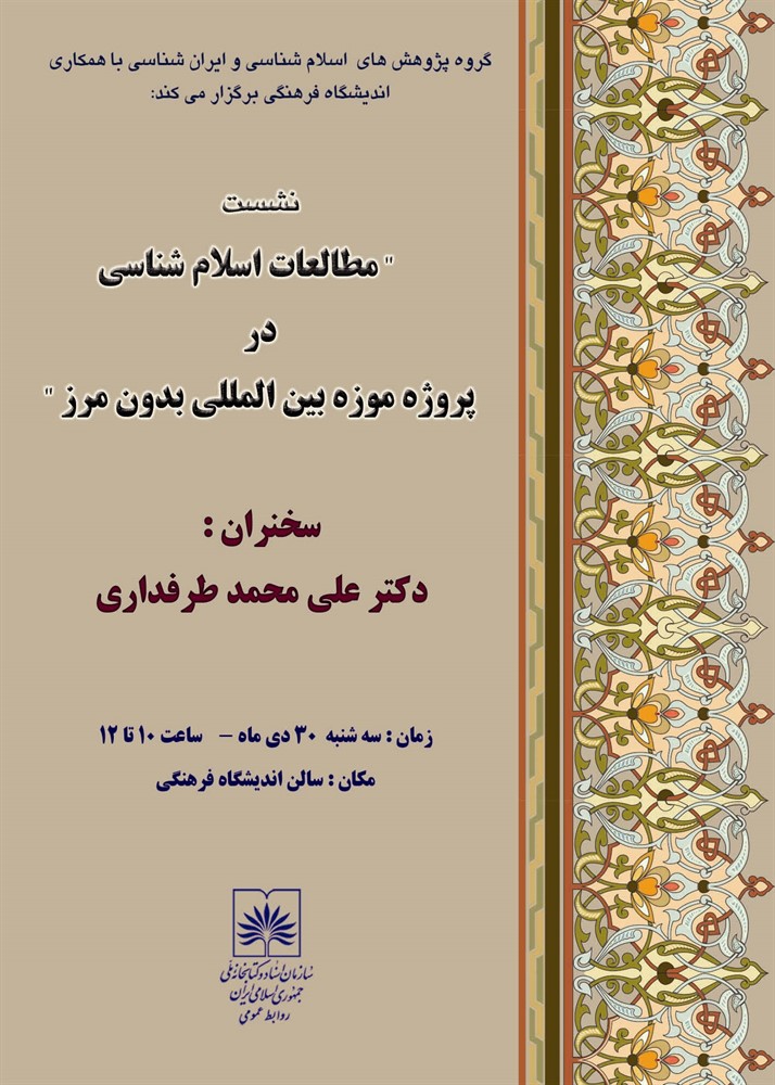 دهمین نشست گروه پژوهش های اسلام شناسی و ایران شناسی در سال 93، با عنوان «مطالعات اسلام شناسی در پروژه موزه بین المللی بدون مرز» با سخنرانی دکتر علیمحمد طرفداری در تاریخ 93/10/30 برگزار شد.