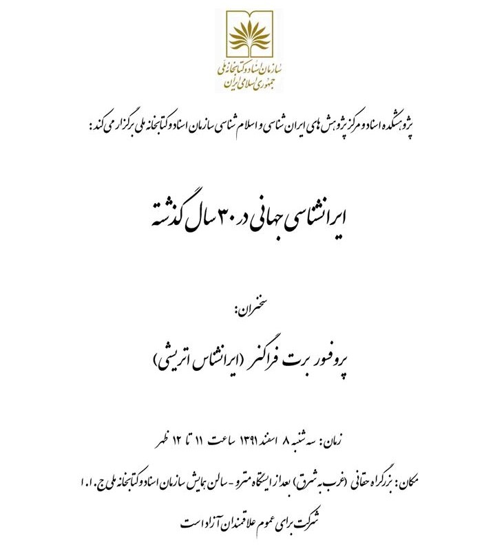 | نشست علمی با عنوان « ایران شناسی جهانی در 30 سال گذشته» با سخنرانی پرفسور برت فراگنر در تاریخ 91/12/8 توسط مرکز ایران شناسی و اسلام شناسی برگزار شد. | ![]() |