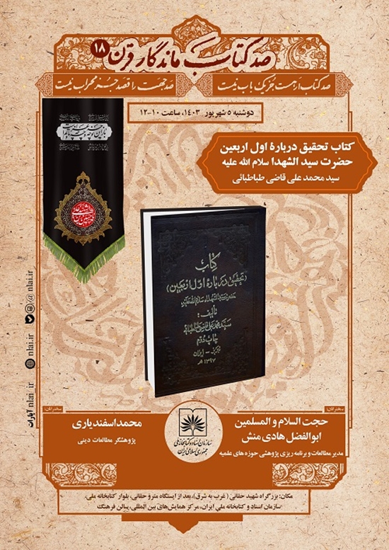 به گزارش روابط عمومی سازمان اسناد و کتابخانه ملّی ایران، کتاب «تحقیق درباره اول اربعین حضرت سید الشهداء(ع)» تألیف علامه سید محمد علی قاضی طباطبائی روز دوشنبه 5 شهریور به عنوان هجدهمین کتاب از «صد کتاب ماندگار قرن» با حضور حجت الاسلام و المسلمین ابوالفضل هادی منش مدیر مطالعات و برنامه ریزی پژوهشی حوزه های علمیه و محمد اسفندیاری پژوهشگر مطالعات دینی، معرفی و بررسی می شود.