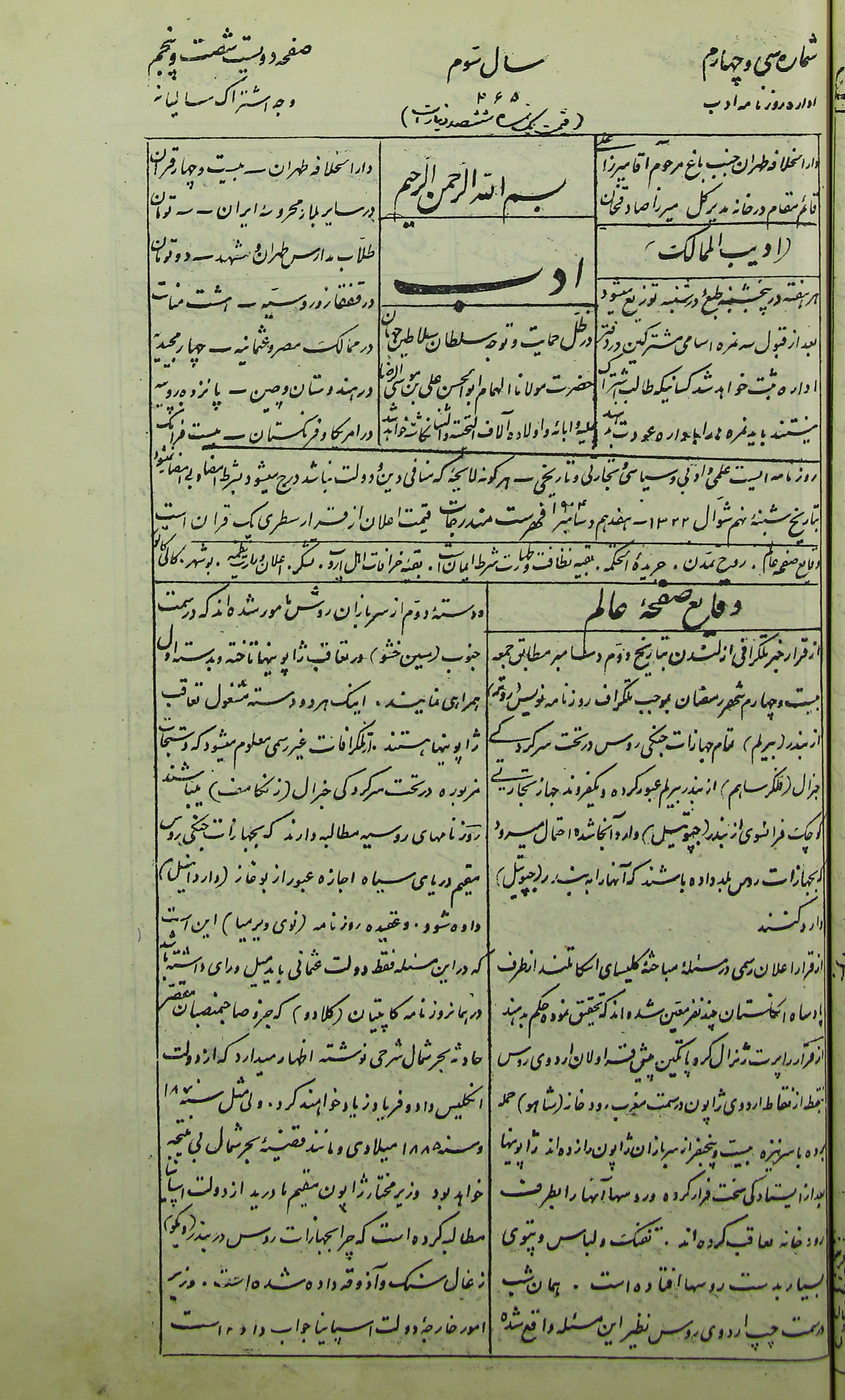 آخرین شماره روزنامه ادب در تهران در تاریخ 18 ربیعالثانی1324 هجری قمری منتشر شد.
