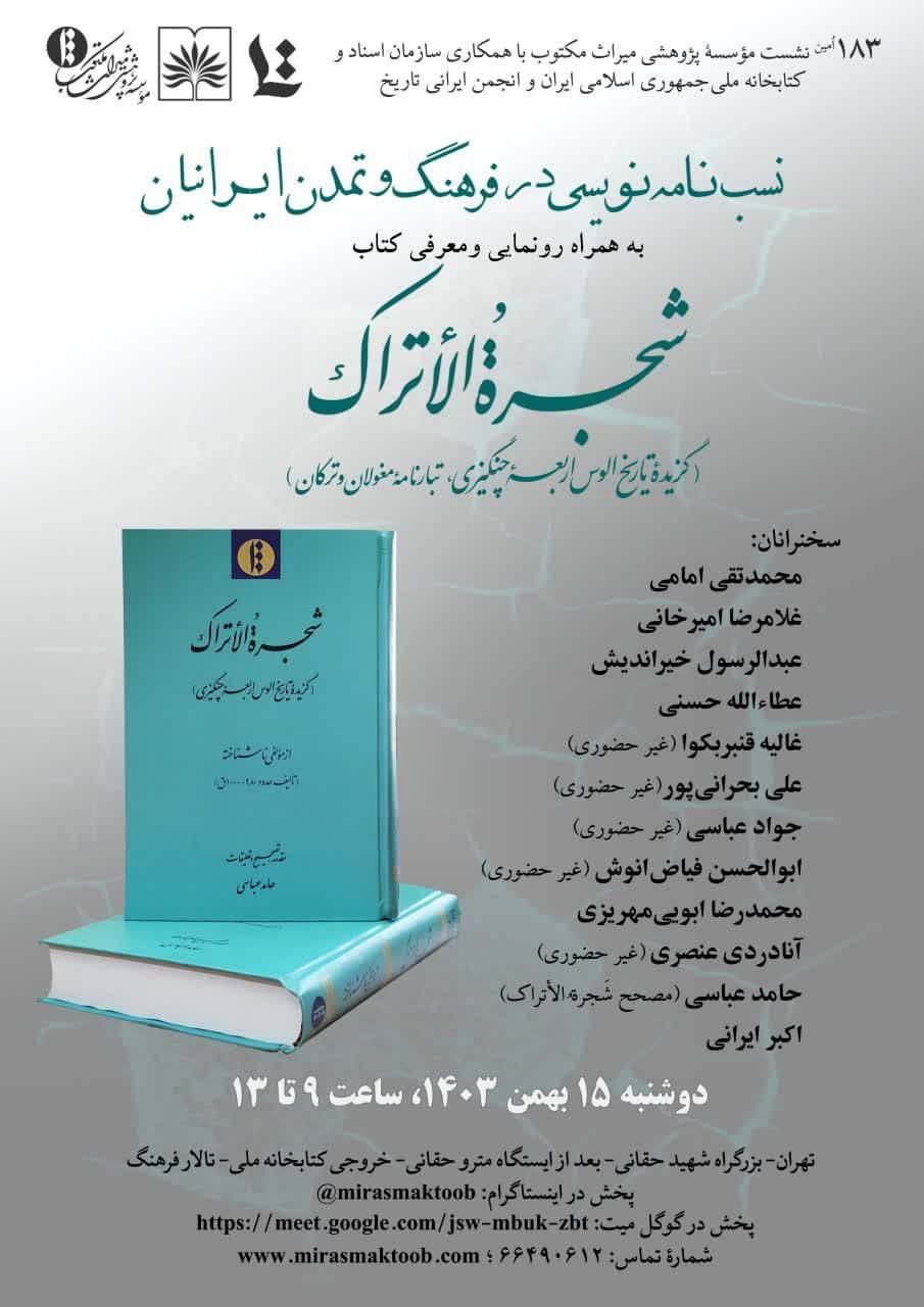 مؤسسه پژوهشی میراث مکتوب با همکاری سازمان اسناد و کتابخانه ملی جمهوری اسلامی ایران و انجمن ایرانی تاریخ، در مراسمی از کتاب «شَجرةُ الاَتراک»، گزیدهای از تاریخ اُلوس اَربعۀ چنگیزی رونمایی میکند.