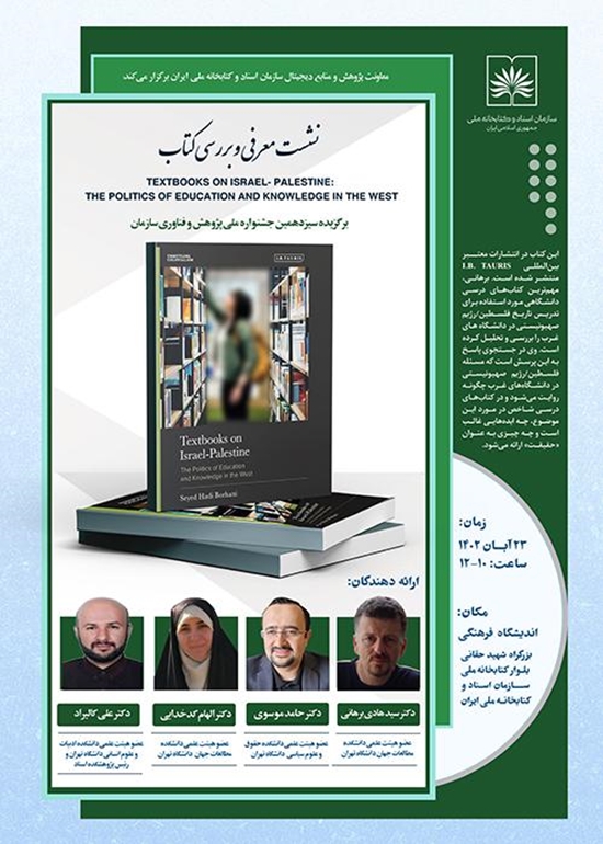 به گزارش روابط عمومی سازمان اسناد و کتابخانه ملّی ایران، این کتاب به زبان انگلیسی و توسط سیدهادی برهانی استادیار دانشکده مطالعات جهان دانشگاه تهران تالیف و با عنوان «Textbooks on Israel-Palestine: The Politics of Education and Knowledge in the West» توسط انتشارات معتبر بینالمللی I.B. Tauris منتشر شده است.