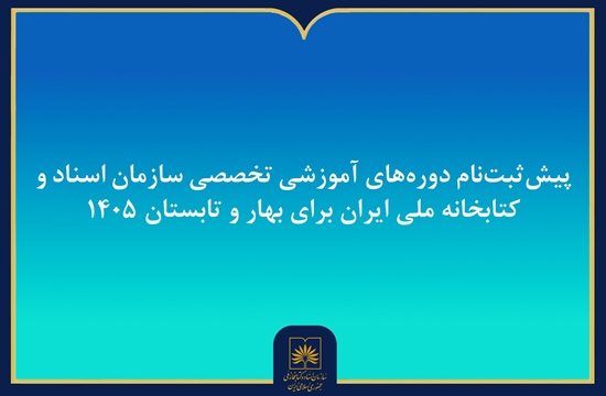 پیشثبتنام دورههای آموزشی تخصصی سازمان اسناد و کتابخانه ملی ایران ویژه بهار و تابستان ۱۴۰۵ در قالب سه دوره آموزشی کتابداری عمومی، مدیریت اسناد و آرشیو و دیجیتالسازی کتابخانهها آغاز شد.