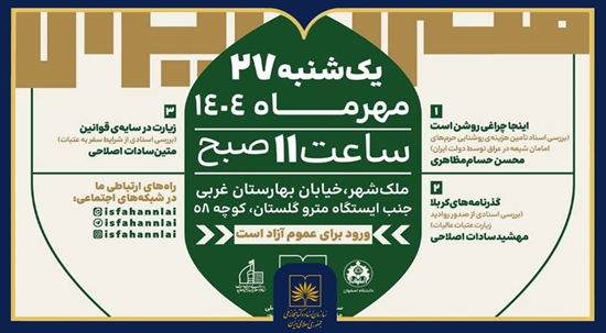این برنامه روز یکشنبه ۲۷ مهرماه ۱۴۰۴ ساعت ۱۱ صبح در محل سازمان اسناد و کتابخانه ملی منطقه مرکزی کشور، واقع در اصفهان، ملکشهر، خیابان بهارستان غربی، جنب ایستگاه مترو گلستان، کوچه ۵۸ برگزار میشود.