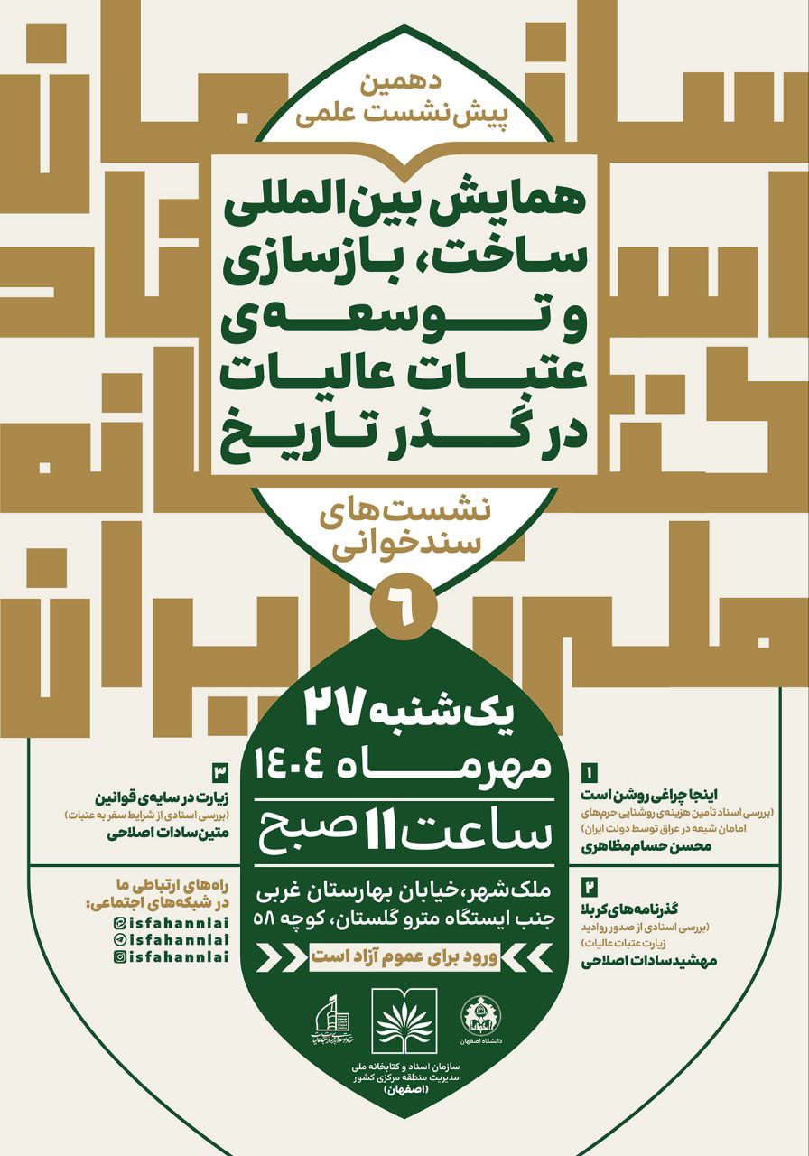 ششمین نشست سندخوانی و دهمین پیشنشست علمی «همایش ساخت، بازسازی و توسعهی عتبات عالیات در گذر تاریخ» با بررسی مجموعهای از اسناد مرتبط با زیارت و خدمات ایرانیان به عتبات عالیات، روز یکشنبه ۲۷ مهرماه در سازمان اسناد و کتابخانه ملی منطقه مرکزی کشور (اصفهان) برگزار میشود.