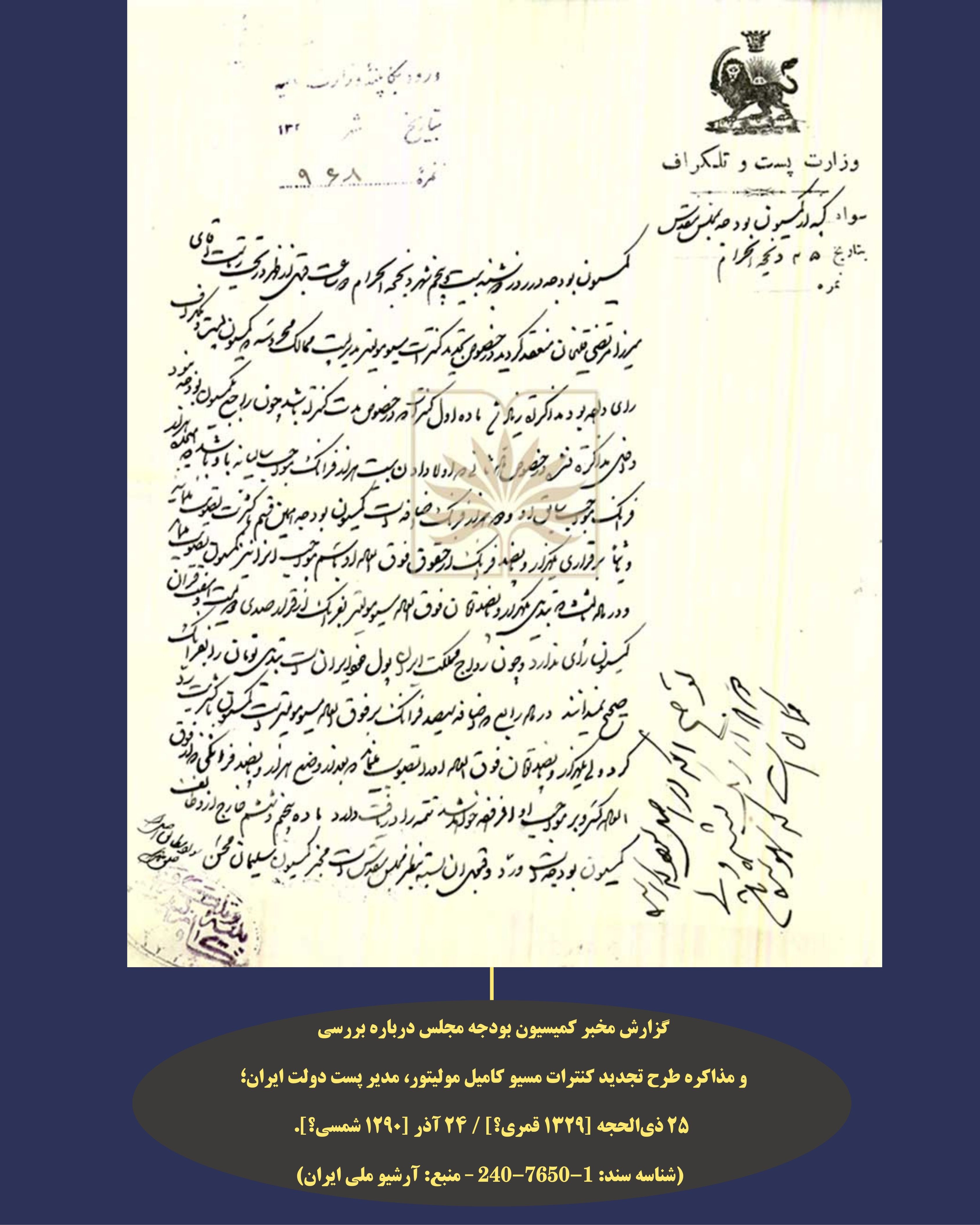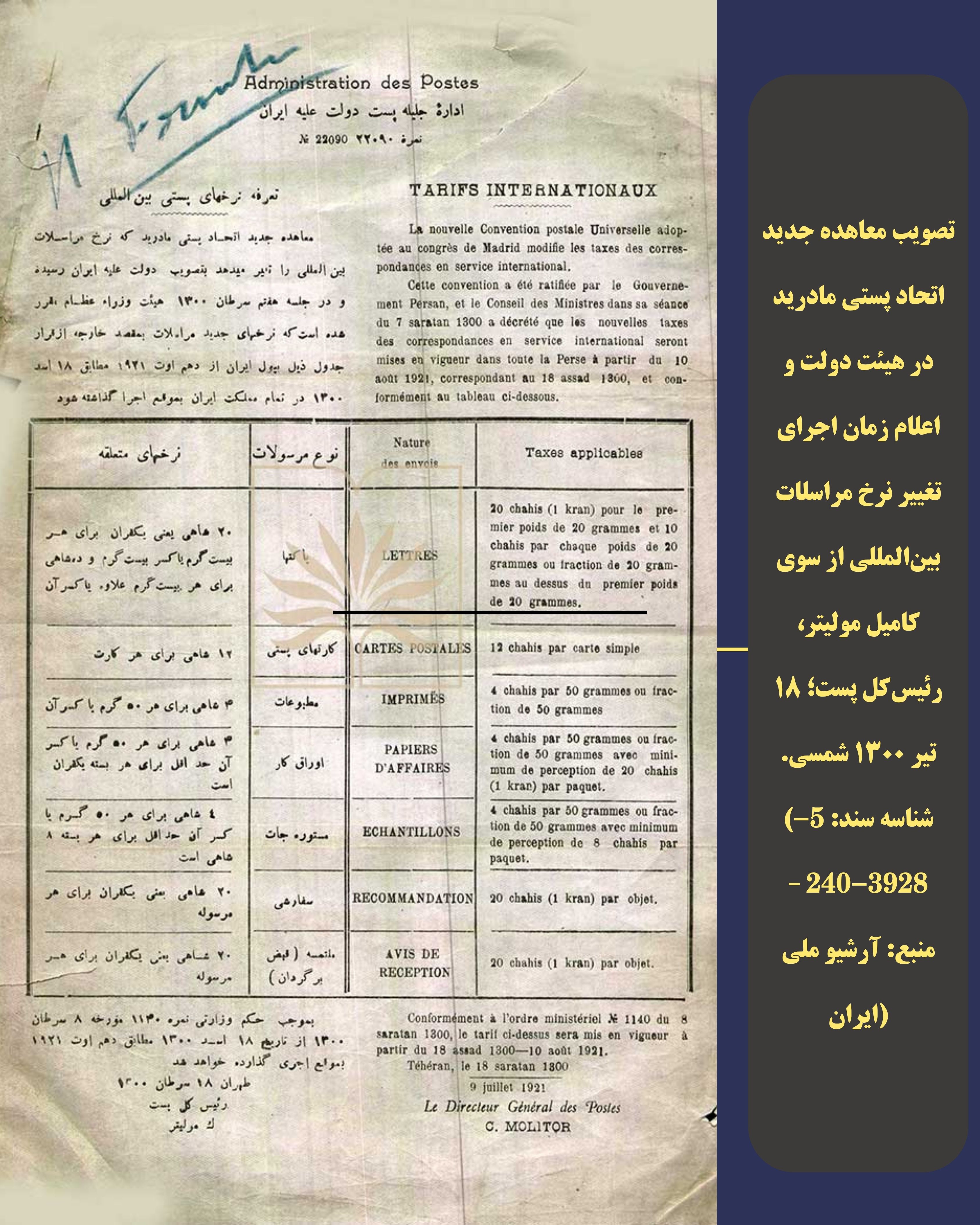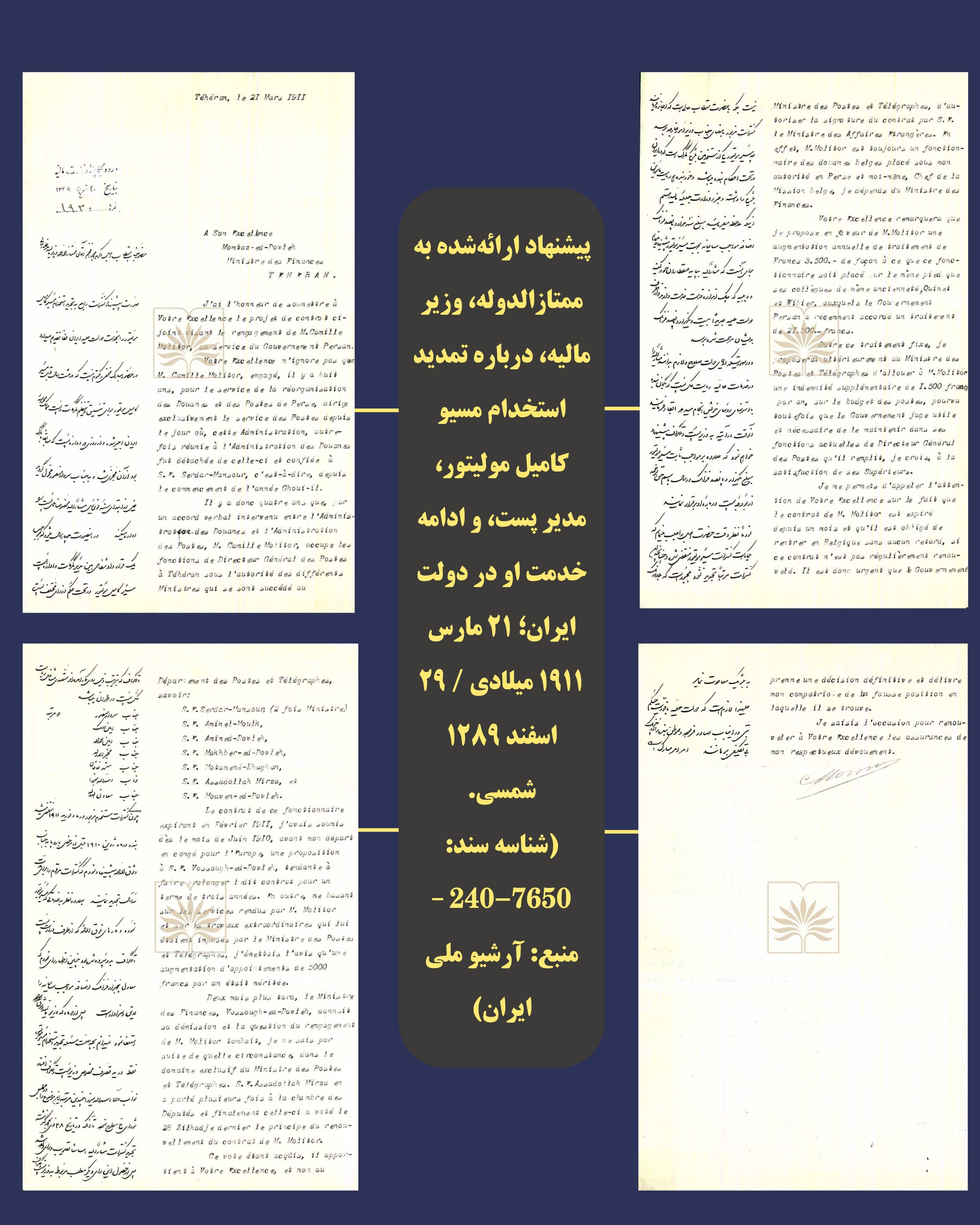 انتشار گزارش تصویری از اسناد مربوط به کامیل مولیتور، مدیر پست دولت ایران