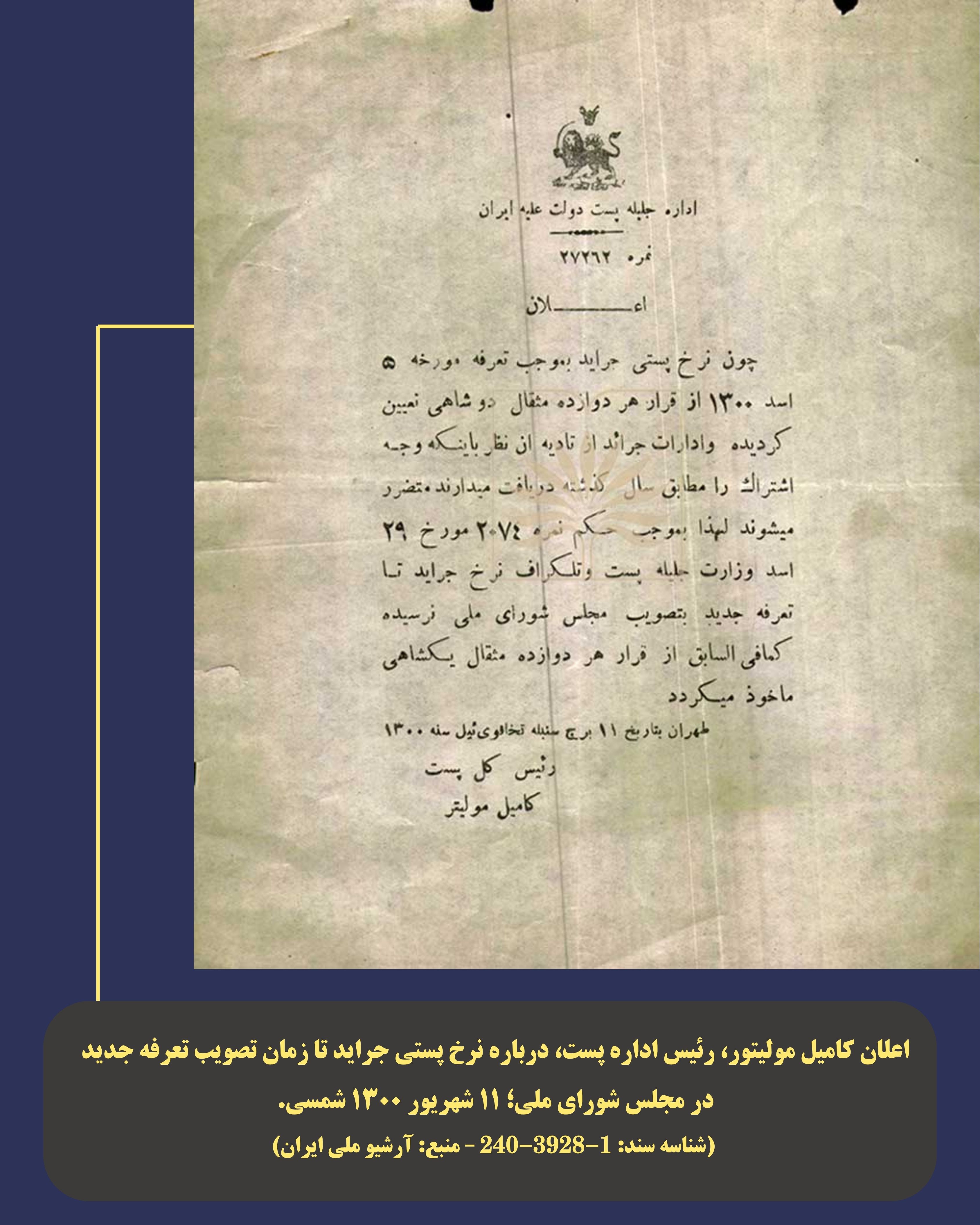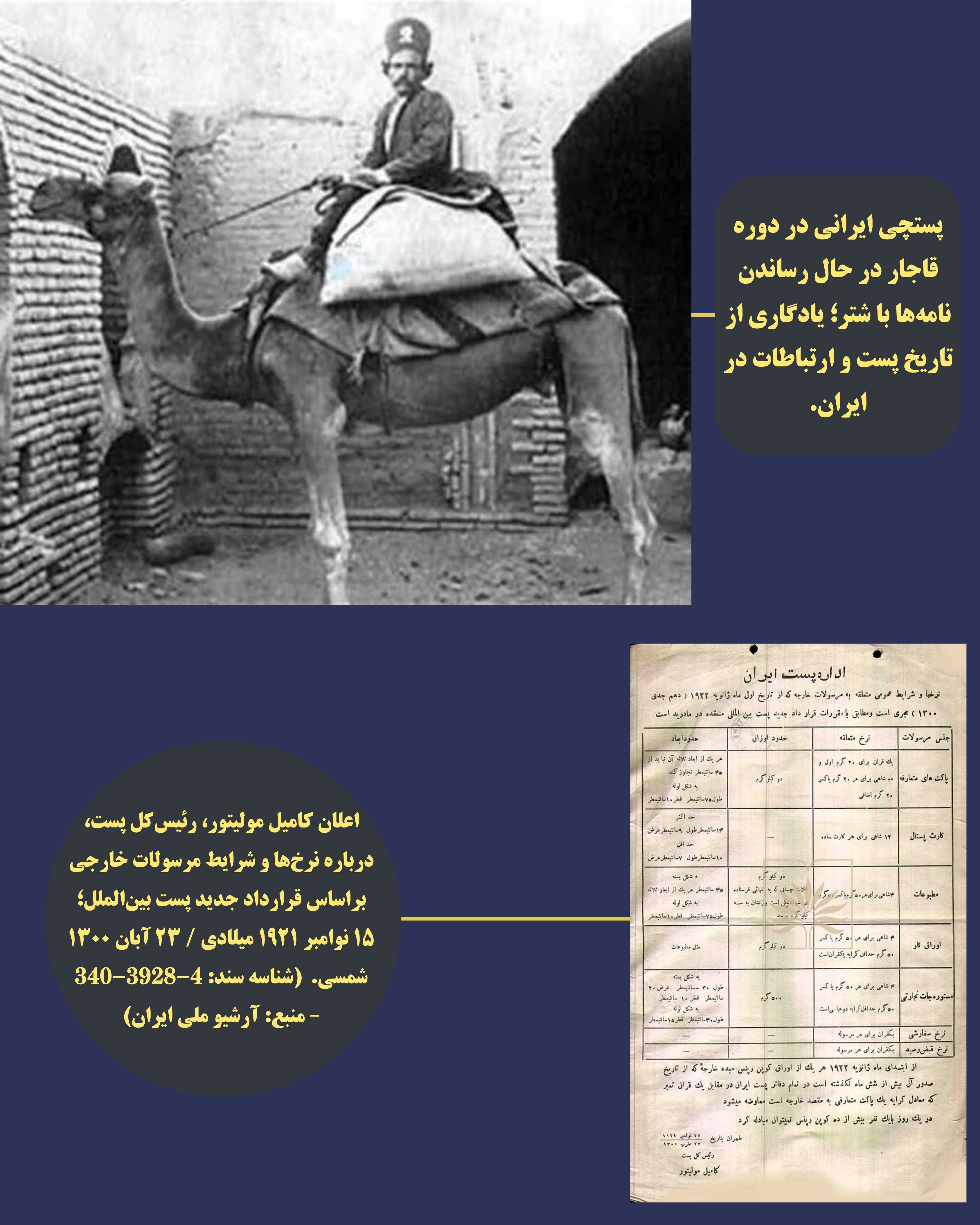 به مناسبت روز جهانی پست، مجموعهای از اسناد و تصاویر تاریخی مربوط به فعالیتهای مسیو کامیل مولیتور، مدیر پست دولت ایران در دوران قاجار، از منابع سازمان اسناد و کتابخانه ملی ایران منتشر شد.