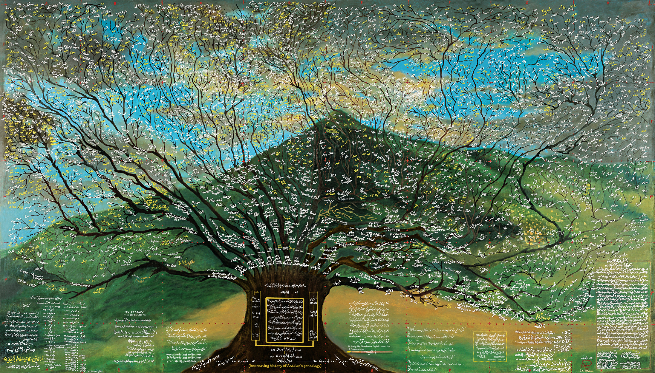 این شجره‌نامه با استفاده از منابع معتبر و اطلاعات گردآوری‌شده از داخل و خارج کشور شکل گرفته است. تصویر اصلی این اثر بر منظره‌‌ای از کوه حسن‌آباد در نزدیکی سنندج ترسیم شده، جایی که امیر حسن اردلان، قلعه‌ای مستحکم به عنوان مرکز حکومت خود ساخته بود.