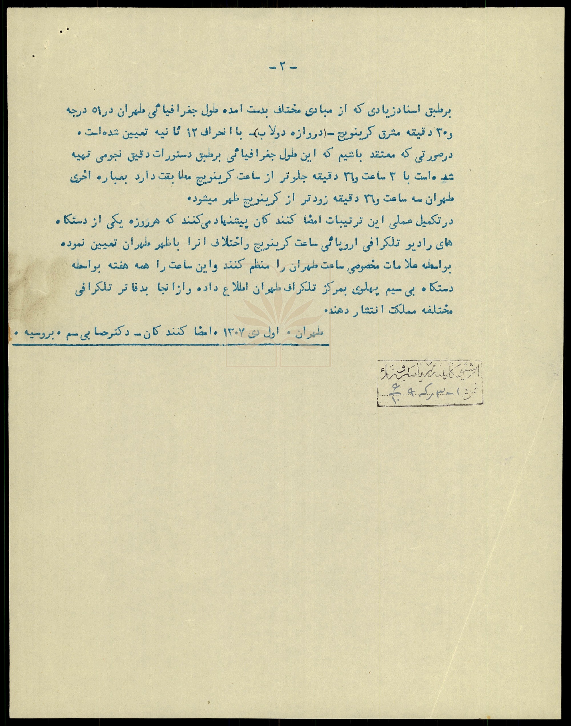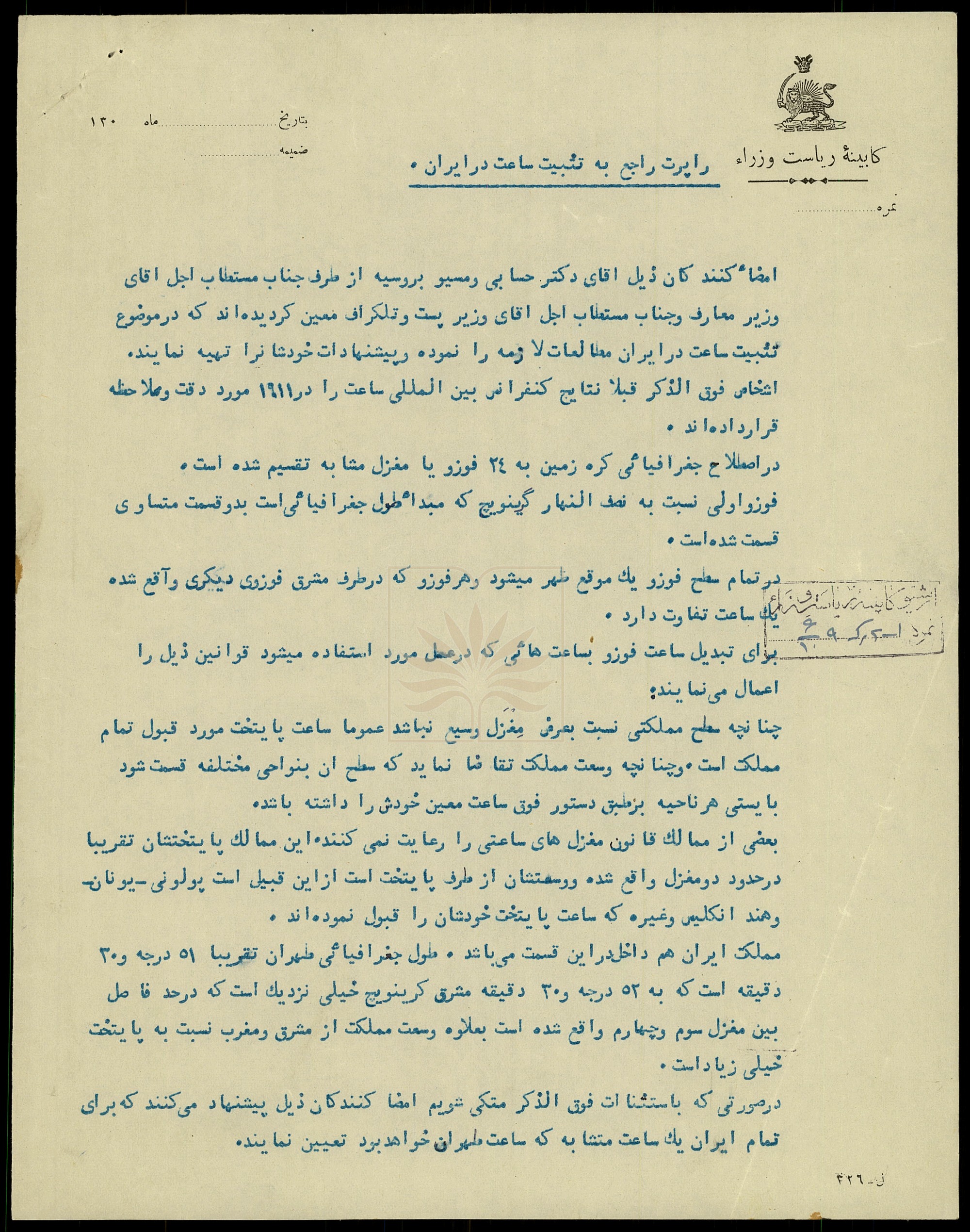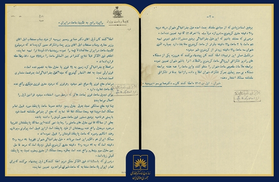 در متن سند تصریح شده است که دکتر حسابی و مسیو بورسیه از سوی وزرای «معارف» و «پست و تلگراف» مأمور شدند تا در خصوص تثبیت ساعت رسمی کشور، مطالعات لازم را انجام داده و نتایج و پیشنهادهای خود را ارائه کنند. آنان با توجه و دقت نظر در نتایج کنفرانس بینالمللی ساعت (۱۹۱۱ م.) و با اتکا به محاسبات جغرافیایی و نجومی، به چالشهای ناشی از گستردگی طول جغرافیایی ایران در تعیین یک ساعت واحد ملی پرداختهاند.