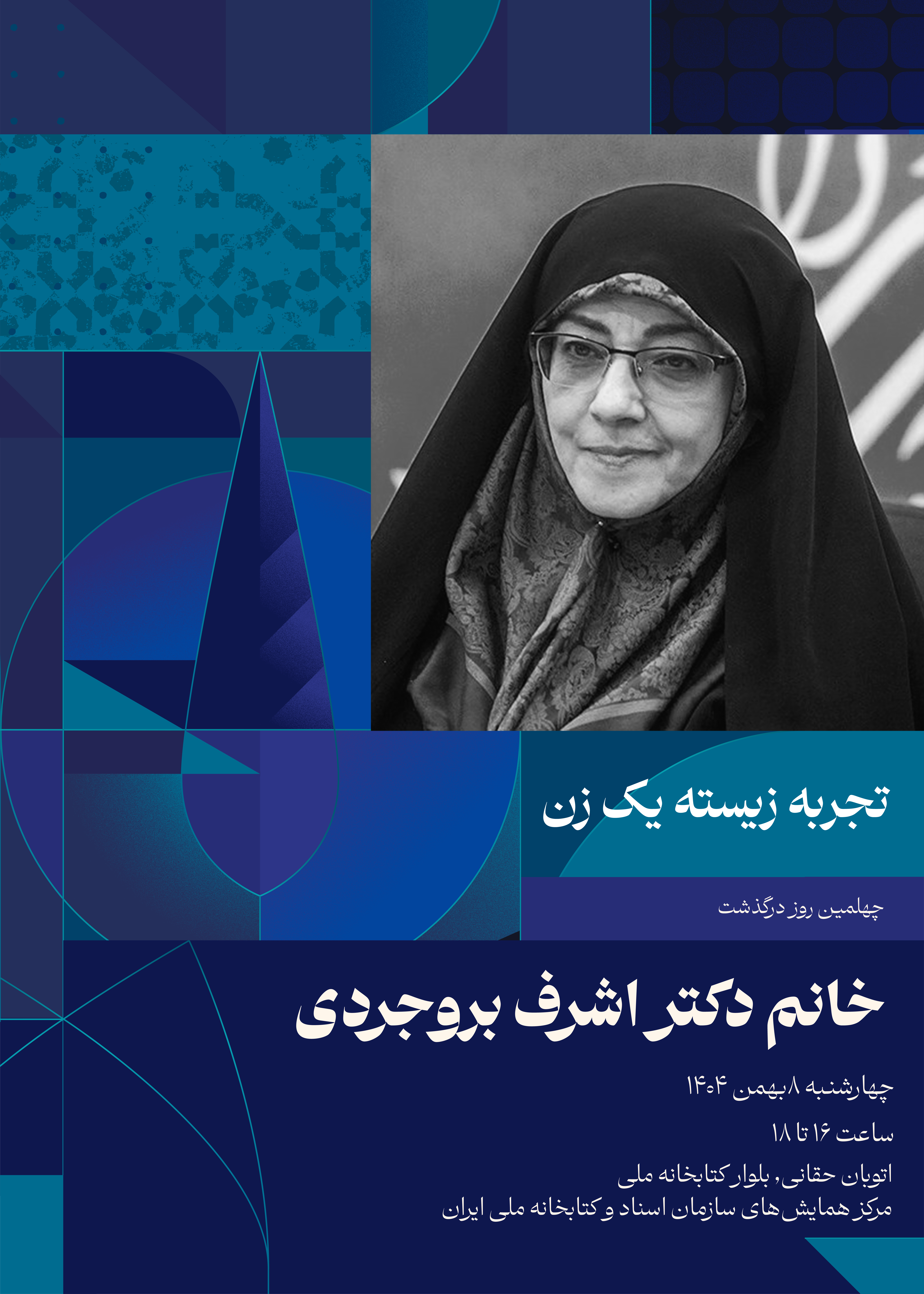 به گزارش روابط عمومی سازمان اسناد و کتابخانه ملی ایران، مراسم یادبود چهلمین روز درگذشت مرحومه اشرف بروجردی، رئیس پیشین این سازمان، با عنوان «تجربه زیسته یک زن»، روز چهارشنبه ۸ بهمن ۱۴۰۴ از ساعت 16 تا 18 در سالن قلم مرکز همایش‌های بین‌المللی سازمان اسناد و کتابخانه ملی ایران برگزار می‌شود.