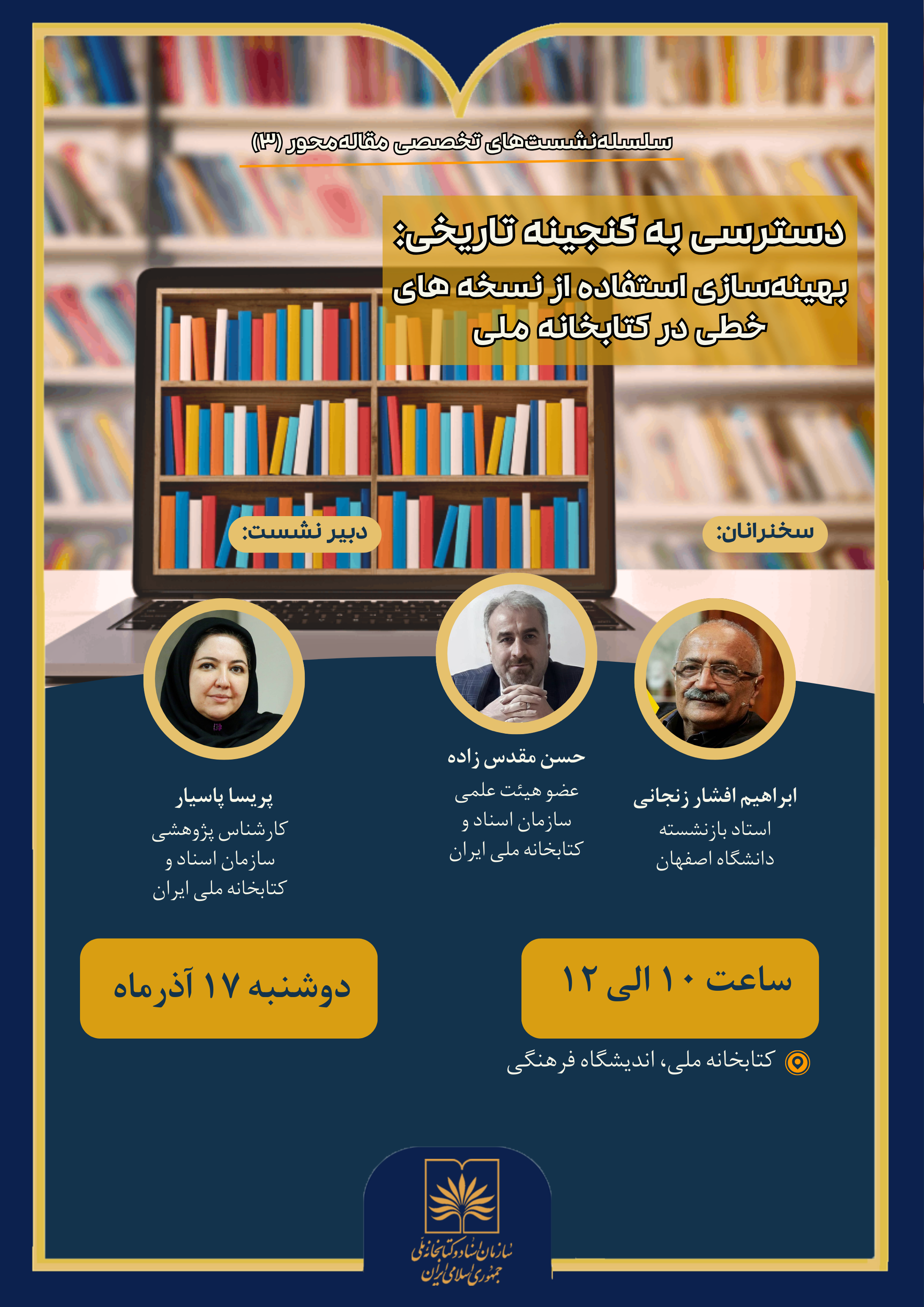 سومین نشست مقالهمحور کتابخانه ملی ایران با تمرکز بر تجربه کتابخانه ملی اندونزی در عمومیسازی نسخ خطی و بهرهگیری از فناوریهای نوین برای افزایش دسترسپذیری 17 آذر ساعت 10 الی 12 برگزار میشود.