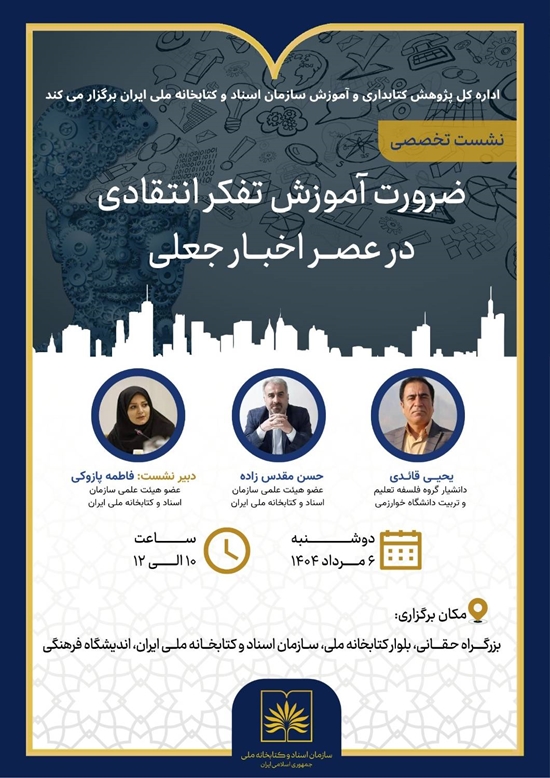 به گزارش روابط عمومی سازمان اسناد و کتابخانه ملی، نشست فوق که به همت اداره کل پژوهش و آموزش این سازمان است به مسئله اخبار جعلی و ضرورتهای آموزش تفکر انتقادی بهعنوان راهکاری موثر و عملی برای مبارزه با اخبار جعلی میپردازد.در انتهای نشست نیز بحث و گفتوگویی انتقادی و سازنده با شرکتکنندگان انجام میشود.سخنرانان این رویداد که با حضور استادان و پژوهشگران برجسته حوزه تعلیم و تربیت و رسانه برگزار میشود، دکتر یحیی قائدی، دانشیار گروه فلسفه تعلیم و تربیت دانشگاه خوارزمی و دکتر حسن مقدسزاده، عضو هیئت علمی سازمان اسناد و کتابخانه ملی ایران هستند؛ دبیر این نشست نیز به عهده دکتر فاطمه پازوکی، عضو هیئت علمی سازمان است.درباره اهداف این نشست آمده است: «امروزه با گسترش رسانهها و بهویژه شبکههای اجتماعی، پیوسته از مجراهای متعدد خبرهای فراوانی در زمینههای مختلف دریافت میکنیم. بسیاری از این اخبار جعلی بوده و صحت ندارند. با توجه به گسترش و همهگیرشدن اخبار جعلی، مسئله شناسایی آنها از اهمیت ویژهای برخوردار است. برای شناسایی اخبار جعلی و مبارزه با آن باید مهارتهای متعددی از جمله مهارتهای سواد رسانهای را آموخت؛ یکی از مهمترین مهارتهای لازم برای تعامل سازنده با رسانهها و تحت تاثیر قرار نگرفتن در عصر اخبار جعلی، مهارتهای تفکر انتقادی است که در نشست ذکر شده به آن پرداخته میشود».این رویداد روز دوشنبه ۶ مرداد ماه از ساعت ۱۰ تا ۱۲ در اندیشگاه فرهنگی کتابخانه ملی ایران برگزار می شود.