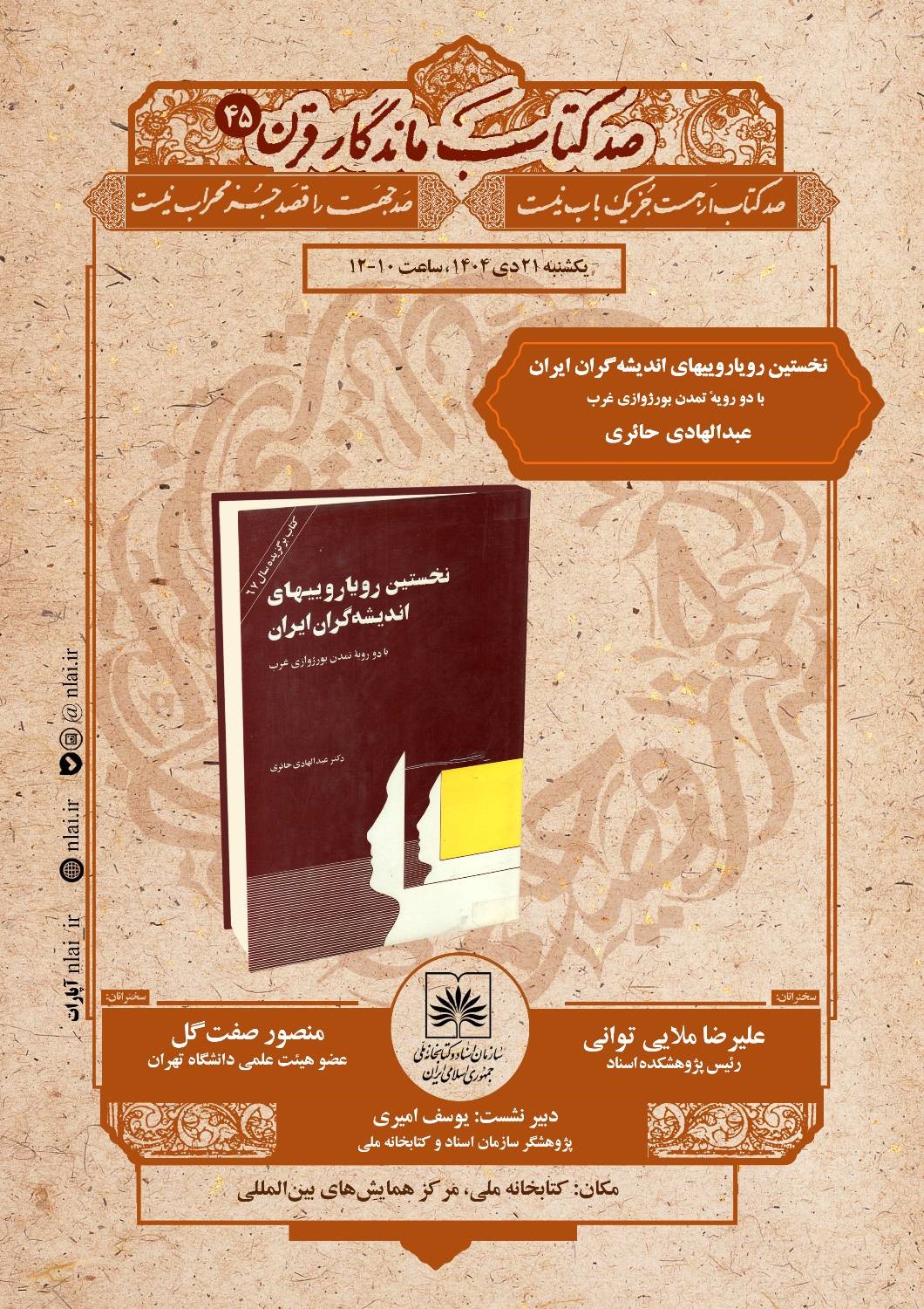 چهل‌وپنجمین نشست از مجموعه‌برنامه‌های «صد کتاب ماندگار قرن» روز یکشنبه ۲۱ دی‌ماه ۱۴۰۴ برگزار می‌شود و به بررسی کتاب «نخستین رویارویی‌های اندیشه‌گران ایران» اثر عبدالهادی حائری اختصاص دارد.