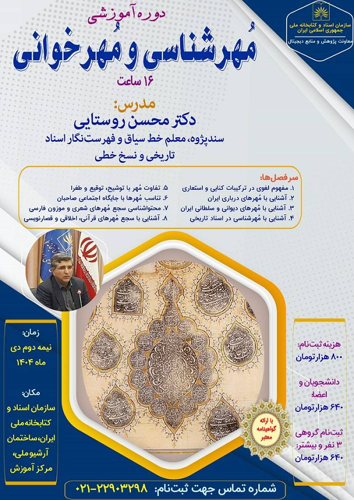 دوره آموزشی «مهرشناسی و مهرخوانی» با تدریس محسن روستایی، در نیمه دوم دی‌ ۱۴۰۴ برگزار می‌شود.