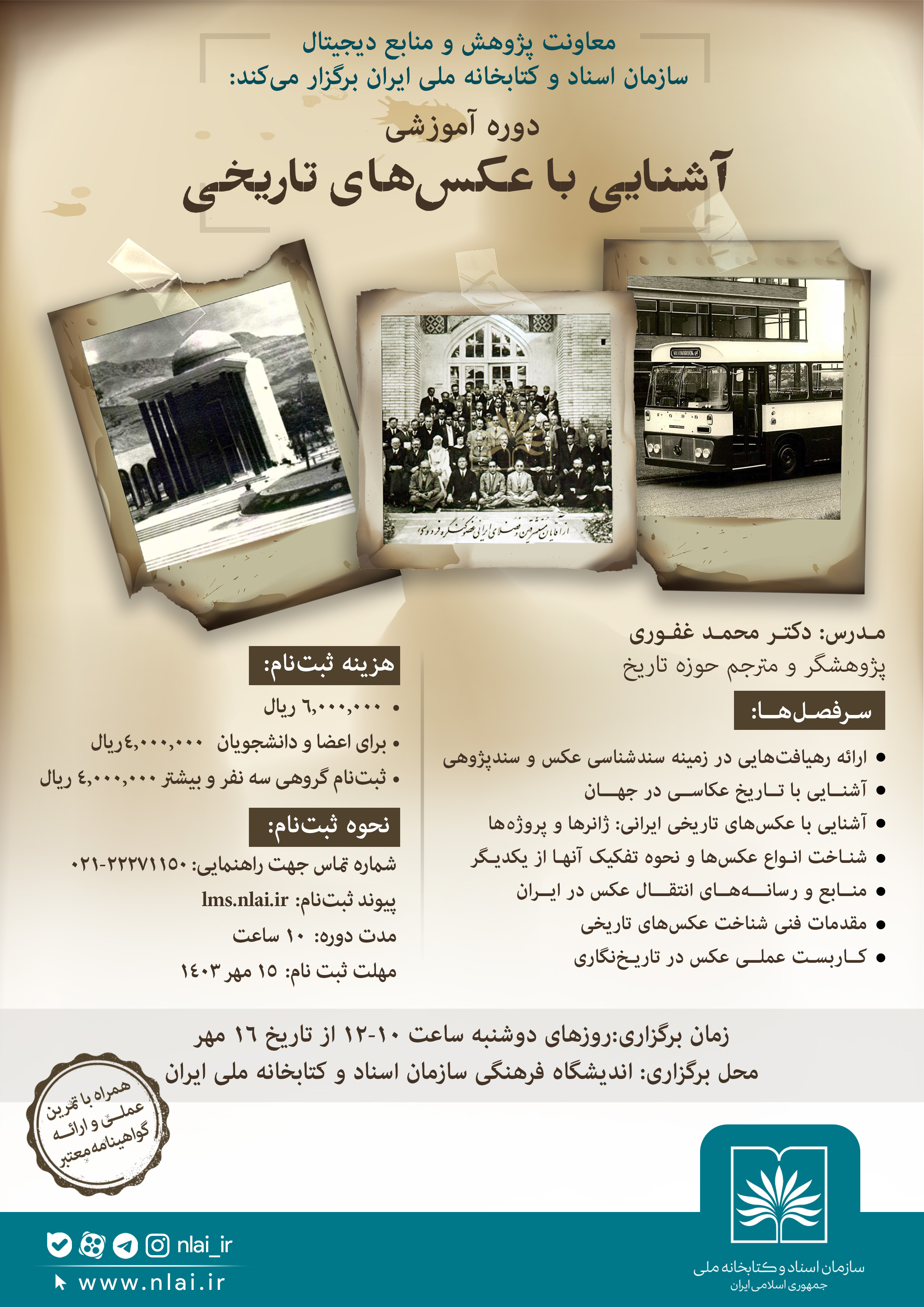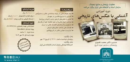 به گزارش روابط عمومی سازمان اسناد و کتابخانه ملی ایران، این دوره آموزشی ۱۰ ساعته از ۱۶ مهرماه، با تدریس دکتر محمد غفوری، پژوهشگر و مترجم حوزه تاریخ، در محل اندیشگاه فرهنگی این سازمان برگزار خواهد شد.در این دوره مطالبی در خصوص تاریخ عکاسی در جهان، آشنایی با عکس‌های تاریخی ایرانی و نحوه کاربست عملی عکس در تاریخ‌نگاری و همچنین رهیافت‌­هایی در زمینه سندشناسی عکس و سند پژوهی مورد برای مخاطبان ارائه خواهد شد.