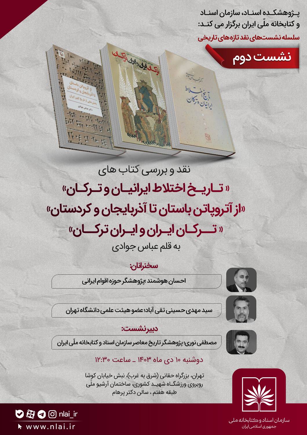 به گزارش روابط عمومی سازمان اسناد و کتابخانه ملی ایران، دومین نشست نقد تازه‌های تاریخی که توسط پژوهشکده اسناد برگزار می‌شود، به بررسی سه کتاب «تاریخ اختلاط ایرانیان و ترکان»، «از آتروپاتن باستان تا آذربایجان و کردستان» و «ترکان ایران و ایران ترکان» اختصاص دارد. این سه اثر، تاریخ پیچیده و چندلایه روابط میان ایرانیان و ترکان و همچنین تحولات تاریخی منطقه آذربایجان و کردستان را واکاوی می‌کنند.