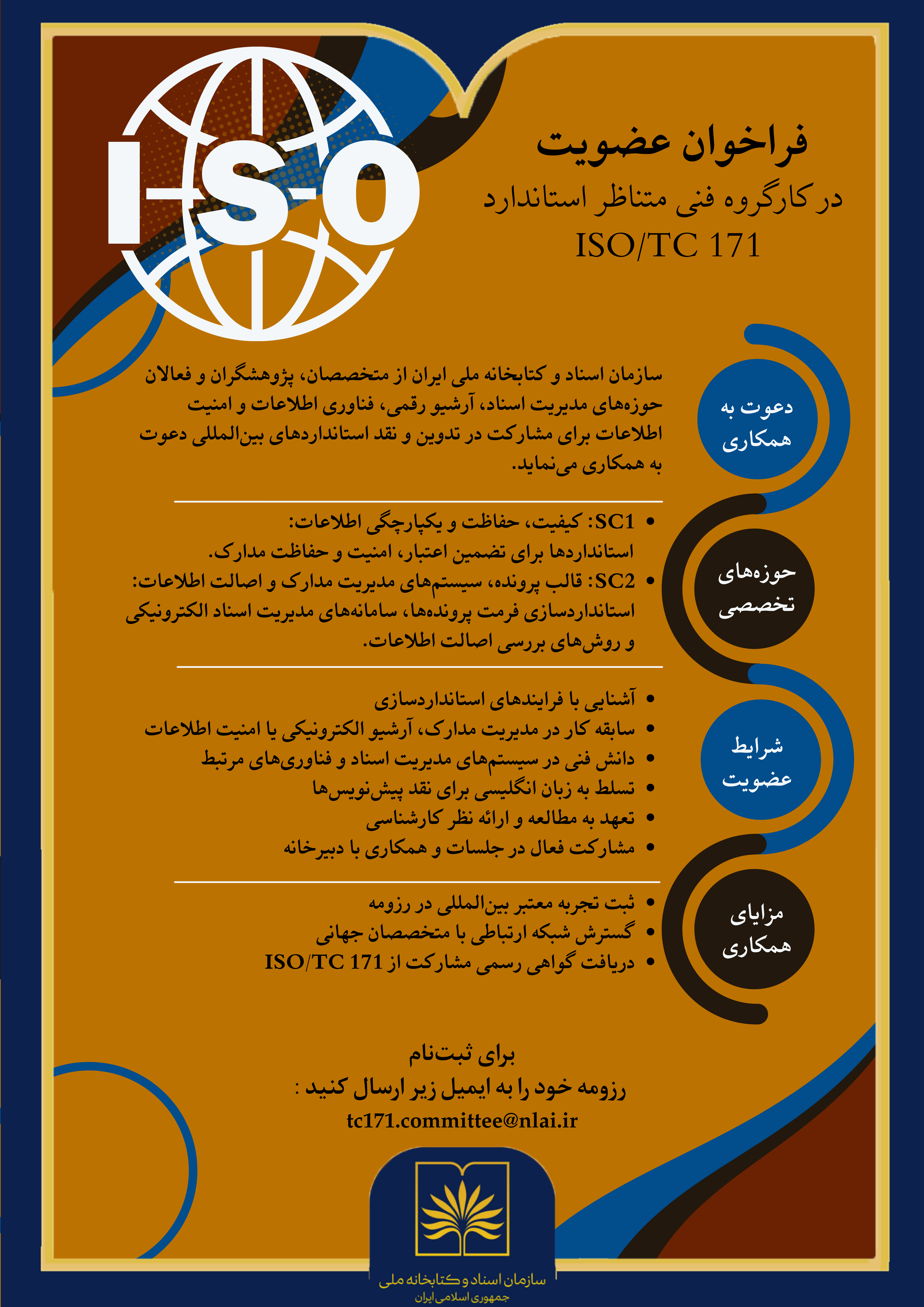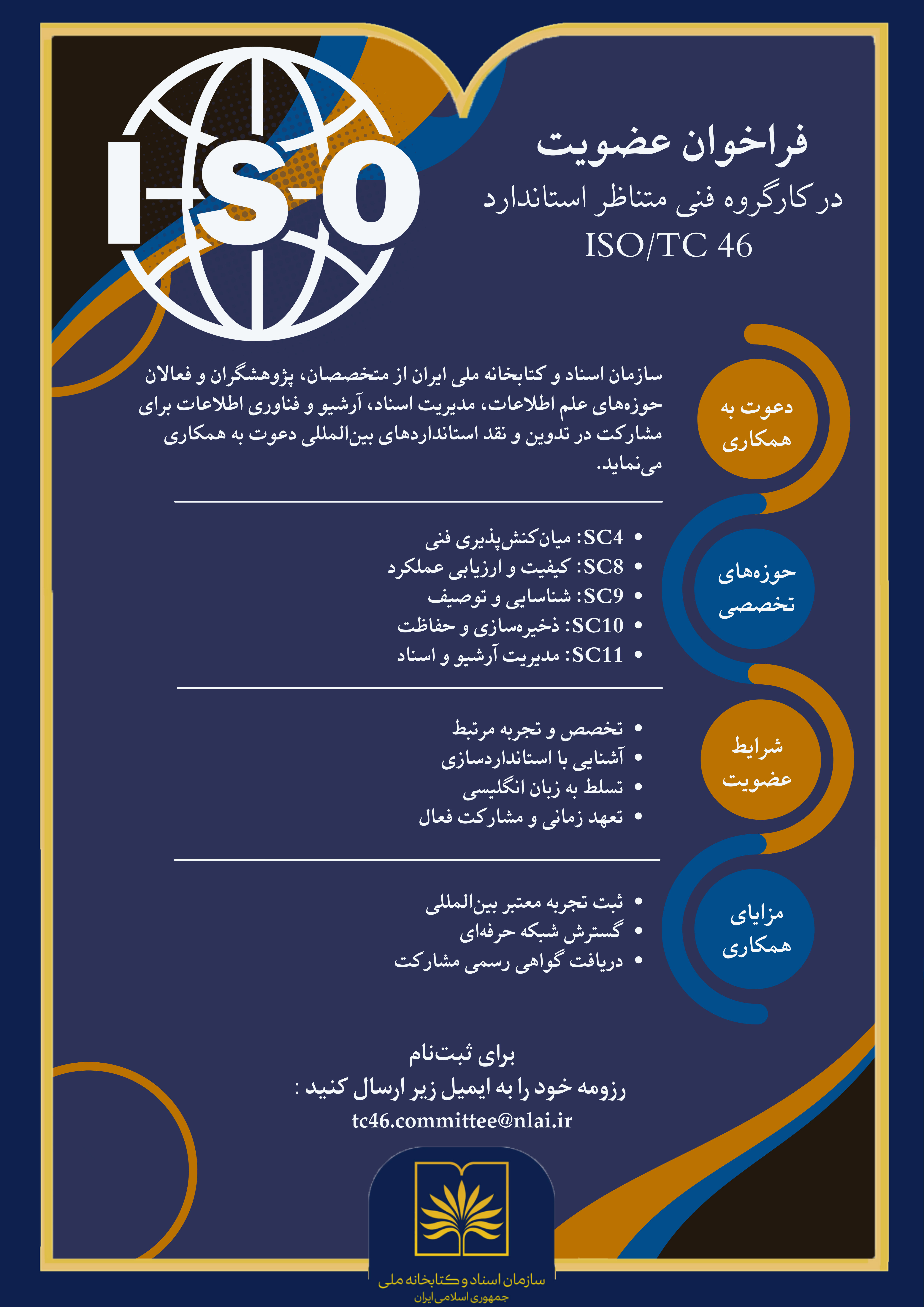 سازمان اسناد و کتابخانه ملی ایران با هدف توسعه همکاری‌های تخصصی در زمینه استانداردسازی بین‌المللی، از متخصصان، پژوهشگران و فعالان حوزه‌های مدیریت اسناد، آرشیو دیجیتال و فناوری اطلاعات دعوت به عضویت در کارگروه‌های فنی متناظر استانداردهای ISO/TC 46 و ISO/TC 171 می‌کند.