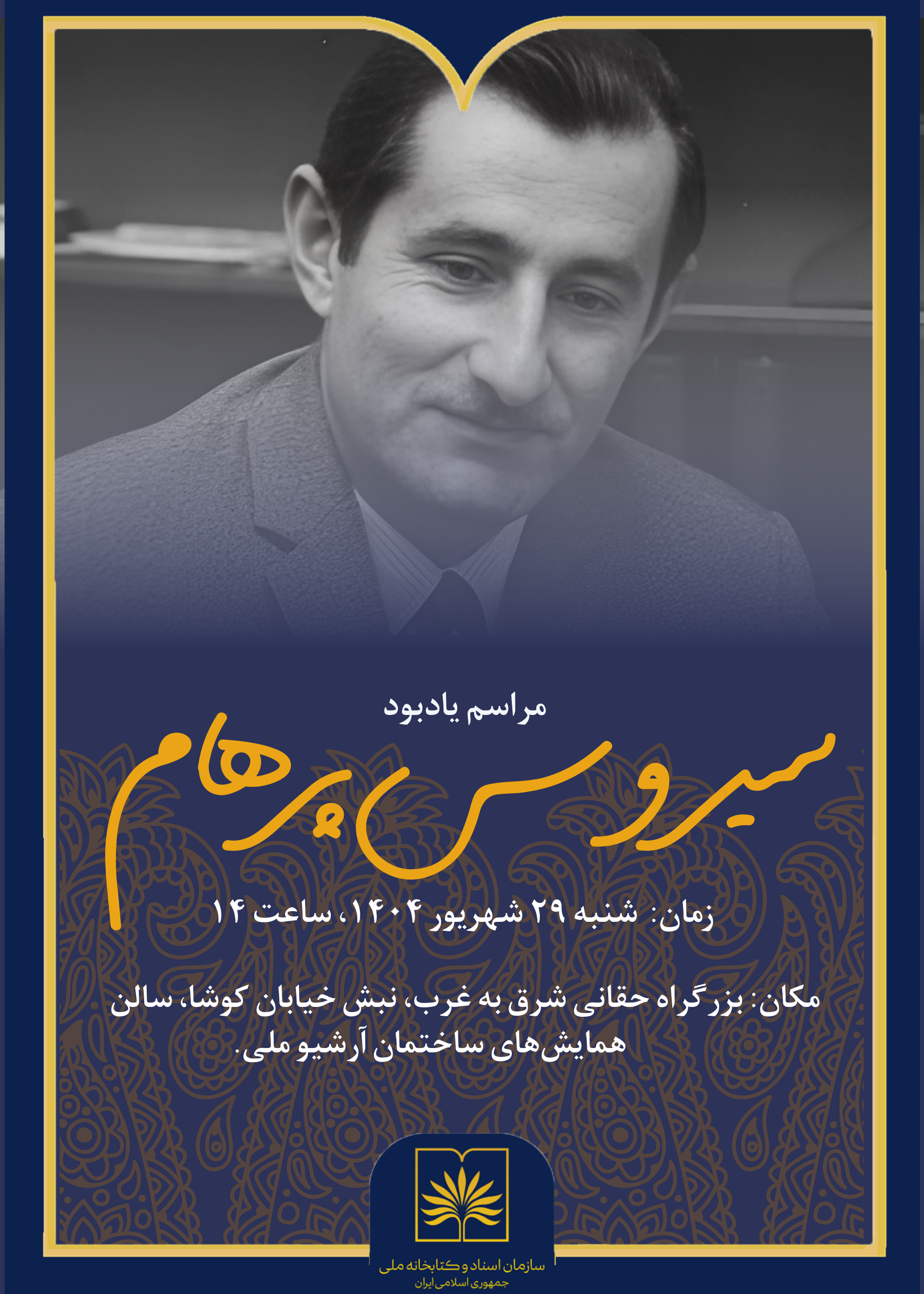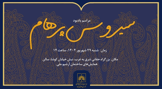 مراسم یادبود سیروس پرهام، بنیان‌گذار آرشیو ملی ایران و از نخستین ویراستاران و فرش‌پژوهان برجسته کشور، روز شنبه ۲۹ شهریورماه ۱۴۰۴ ساعت ۱۴ در سالن همایش‌های ساختمان آرشیو ملی ایران برگزار خواهد شد.