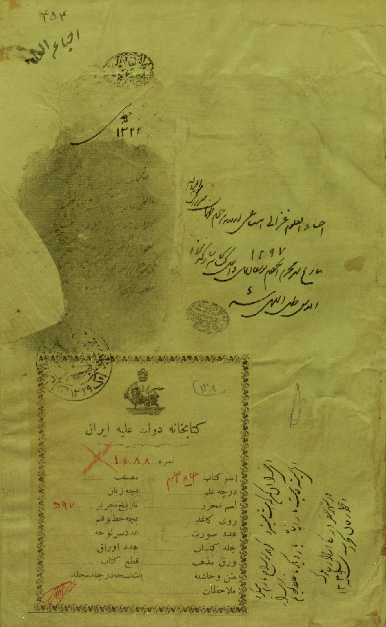 در برگهای آغازین نسخه چند مهر مالکیت دیده میشود که نقش برخی از آنها عبارتند از: «مهری بیضیشکل با نقش «مشیرالسلطنه» و مهر چهارگوش با نقش «بنده شاه ولایت طهماسب». در برگ ظهریه نسخه، اشعاری از مثنوی معنوی دیده میشود که به تاریخ ۱۲۴۹ هجری قمری و در یکی از مزارع بلوک دهخوارقان کتابت شدهاند. همچنین یادداشتی در خصوص خرید این نسخه از ورثه طهماسب میرزا بن مویدالدوله به تاریخ ۱۲۹۷ هجری قمری وجود دارد. در برگ پایانی نیز فهرست مطالب نسخه بهصورت منظم آمده است.