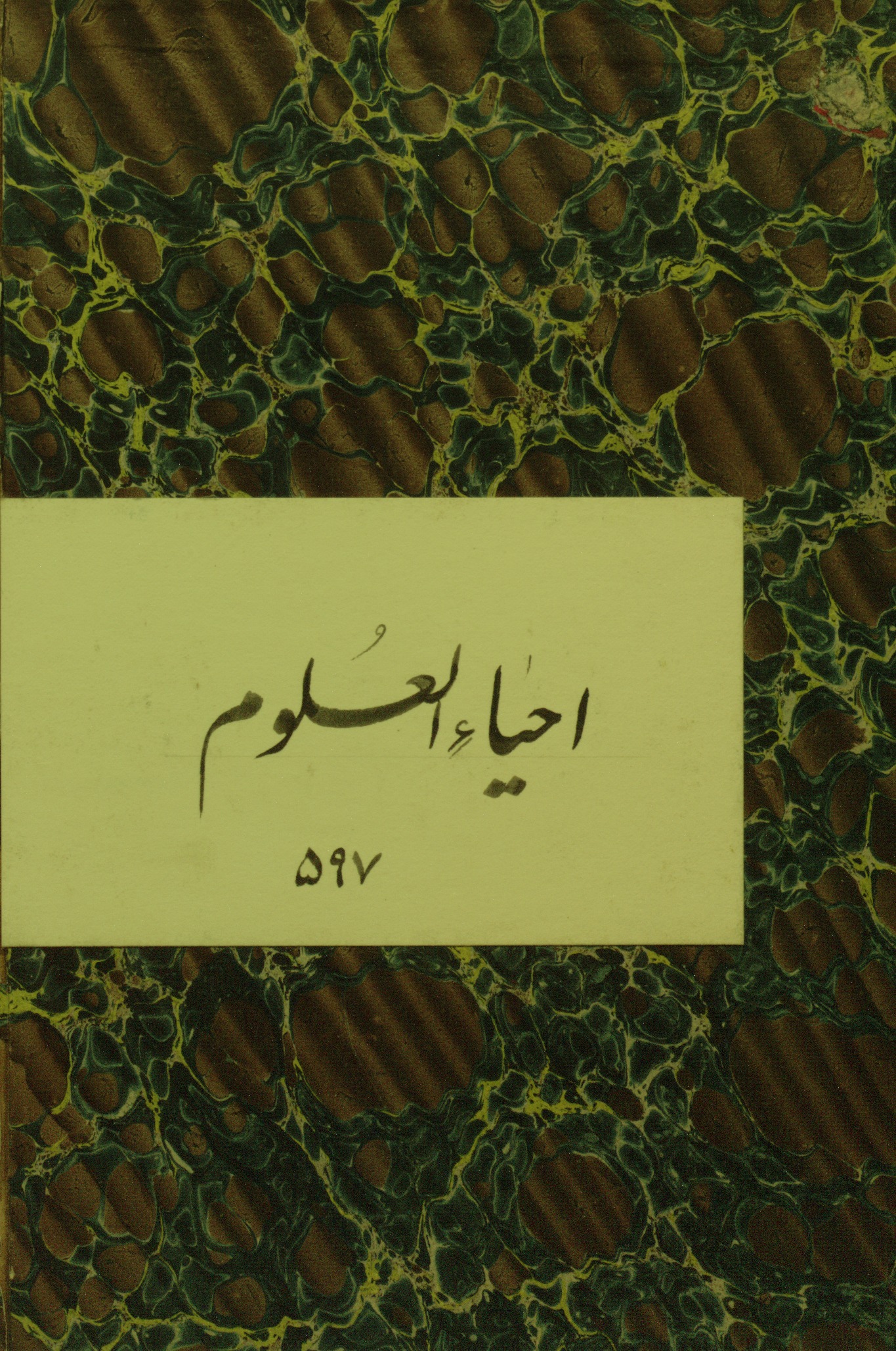 نسخه خطی و نفیس کتاب احیاء علومالدین به خط «نسخ جلی» و بر روی کاغذ ضخیم نخودی آهارمهره نگاشته شده است. کاتب نسخه، در تاریخ ۸ جمادیالثانی سال ۵۹۷ هجری قمری آن را کتابت کرده است.