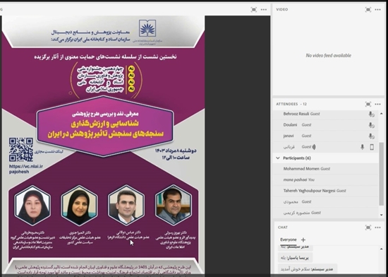 نخستین نشست از سلسله نشستهای حمایت معنوی از آثار برگزیده چهاردهمین جشنواره ملی پژوهش و فناوری سازمان اسناد و کتابخانه ملی ایران با ارائه و بررسی طرح پژوهشی «شناسایی و ارزشگذاری سنجههای سنجش تاثیر پژوهش در ایران» به صورت مجازی برگزار شد.
