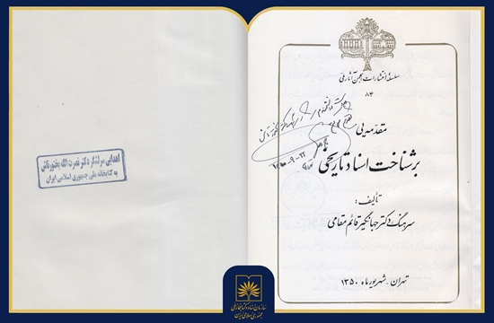 نسخه‌ای اهدایی از «مقدمه‌یی بر شناخت اسناد تاریخی» در کتابخانه ملی ایران