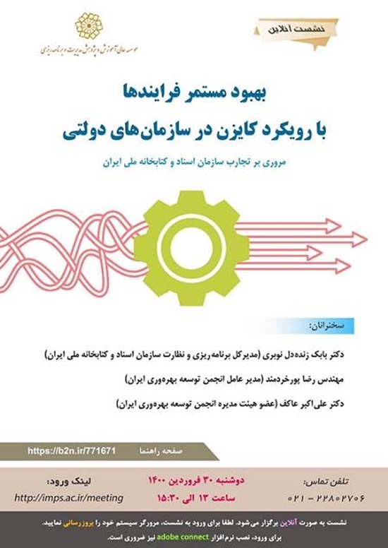 بابک زنده دل نوبری مدیرکل برنامه ریزی و نظارت سازمان اسناد و کتابخانه ملی ایران، رضا پور خردمند مدیرعامل انجمن توسعه بهره وری ایران و علی اکبر عاکف عضو هیات مدیره انجمن توسعه بهره وری ایران، سخنرانان این نشست آنلاین خواهند بود.