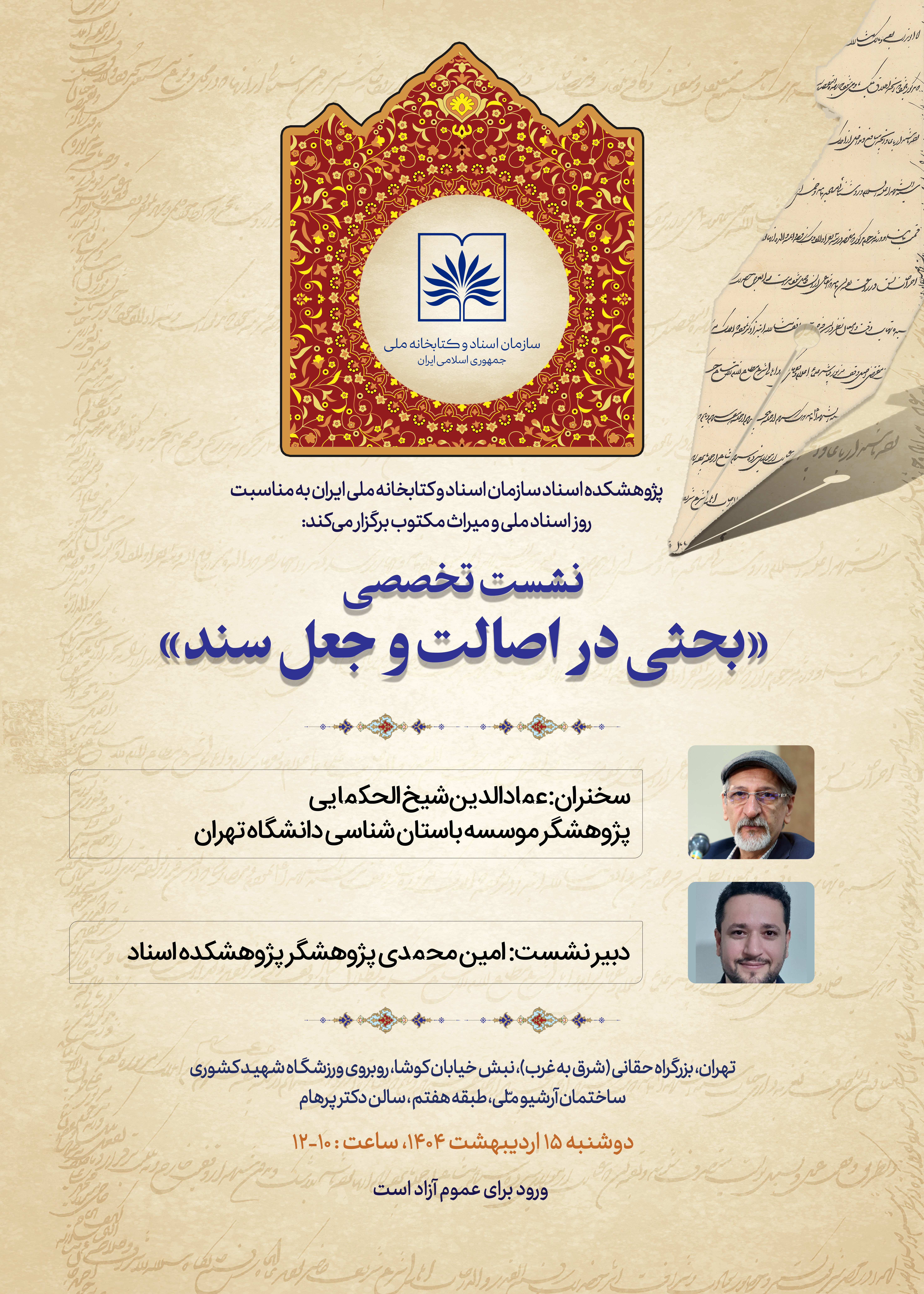 به گزارش روابط عمومی سازمان اسناد و کتابخانه ملی ایران، این نشست تخصصی با تمرکز بر تحلیل یک سند نویافته و بررسی جنبههای مختلف جعل و اعتبارسنجی اسناد تاریخی، روز دوشنبه ۱۵ اردیبهشت ۱۴۰۴ از ساعت ۱۰ تا ۱۲ در سالن پرهام ساختمان آرشیو ملی برگزار خواهد شد.