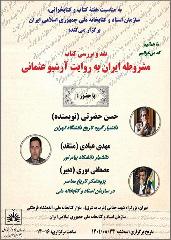 نشست نقد و بررسی کتاب «مشروطه ایران به روایت آرشیو عثمانی» به مناسبت هفته کتاب در سازمان اسناد و کتابخانه ملّی ایران برگزار می شود.