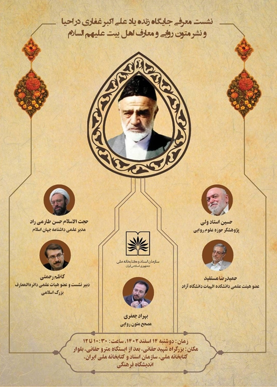 نشست گرامیداشت جایگاه زنده یاد علی اکبر غفاری در احیا و نشر متون روایی و معارف اهل بیت علیهم السلام، در سازمان اسناد و کتابخانه ملی ایران برگزار میشود.