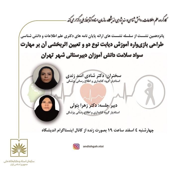 نشست کارگروه علم اطلاعات با عنوان « طراحی بازیواره آموزش دیابت نوع دو و تعیین اثربخشی آن بر مهارت سواد سلامت دانش آموزان دبیرستانی شهر تهران» روز چهارشنبه 4 اسفند ماه ساعت 19 به صورت مجازی برگزار می شود.