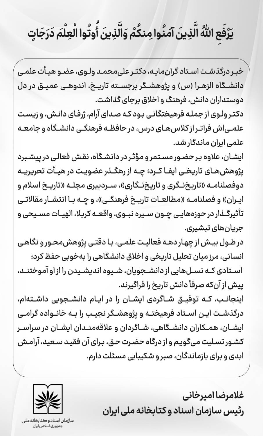 رئیس سازمان اسناد و کتابخانه ملی ایران، در پیامی، درگذشت استاد فرهیخته، دکتر علی‌محمد ولوی را تسلیت گفت و با جامعه علمی و فرهنگی کشور و خانواده محترم ایشان ابراز همدردی کرد.