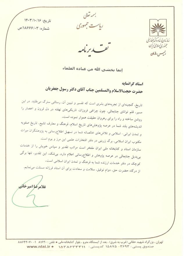 به گزارش روابط عمومی سازمان اسناد و کتابخانه ملی ایران، در این مراسم که با حضور چهره‌های برجسته علمی و فرهنگی برگزار شد، غلامرضا امیرخانی، رئیس سازمان، بااهدای لوح تقدیر خدمات دکتر رسول جعفریان در عرصه پژوهش‌های تاریخی را ستود.