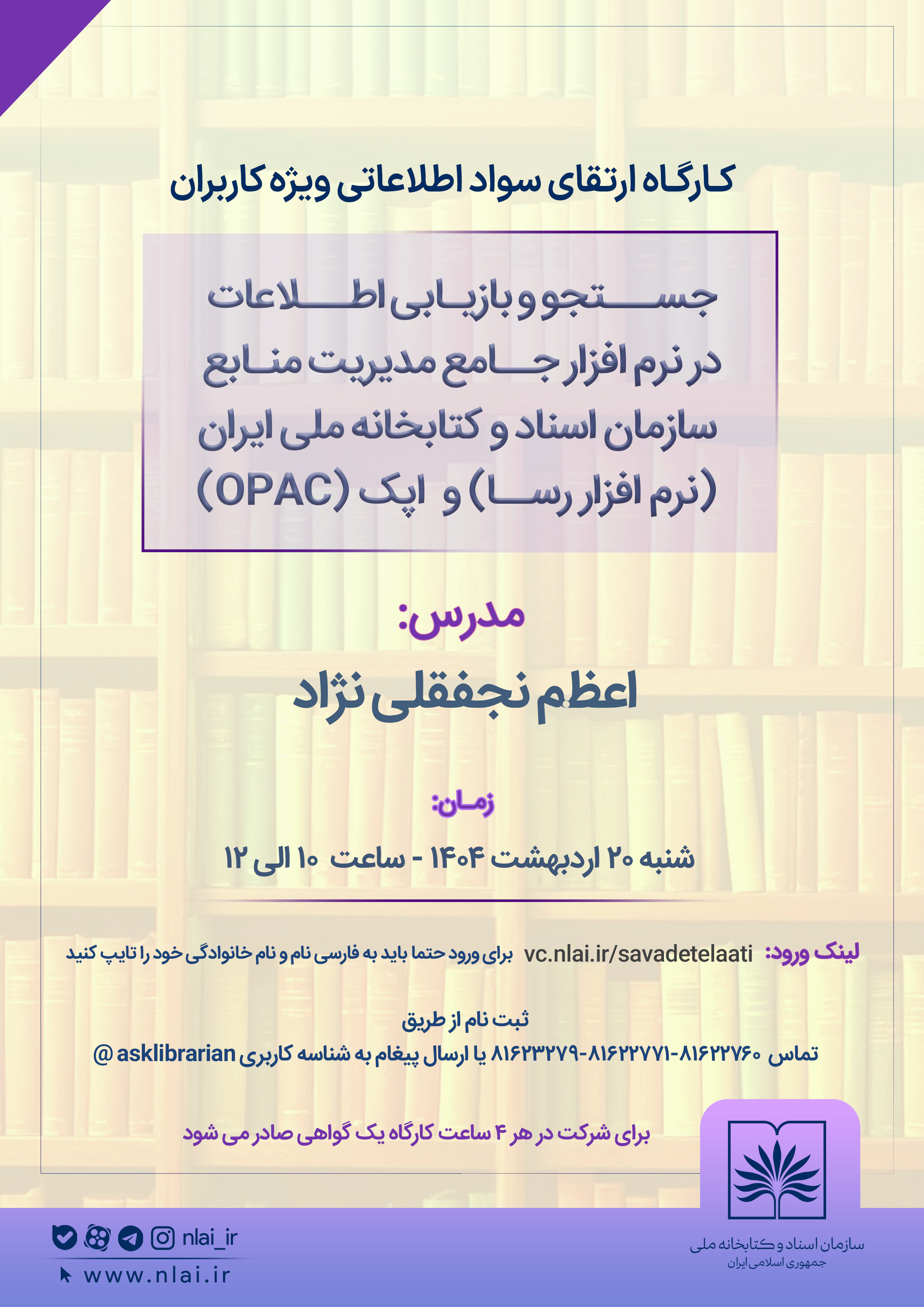 این کارگاه با تدریس اعظم نجفقلی‌نژاد، روز شنبه 20 اردیبهشت 1404، از ساعت 10 تا 12 به صورت آنلاین برگزار خواهد شد. علاقه-مندان می‌توانند از طریق لینک vc.nlai.ir/savadetelaati در این کارگاه شرکت کنند.