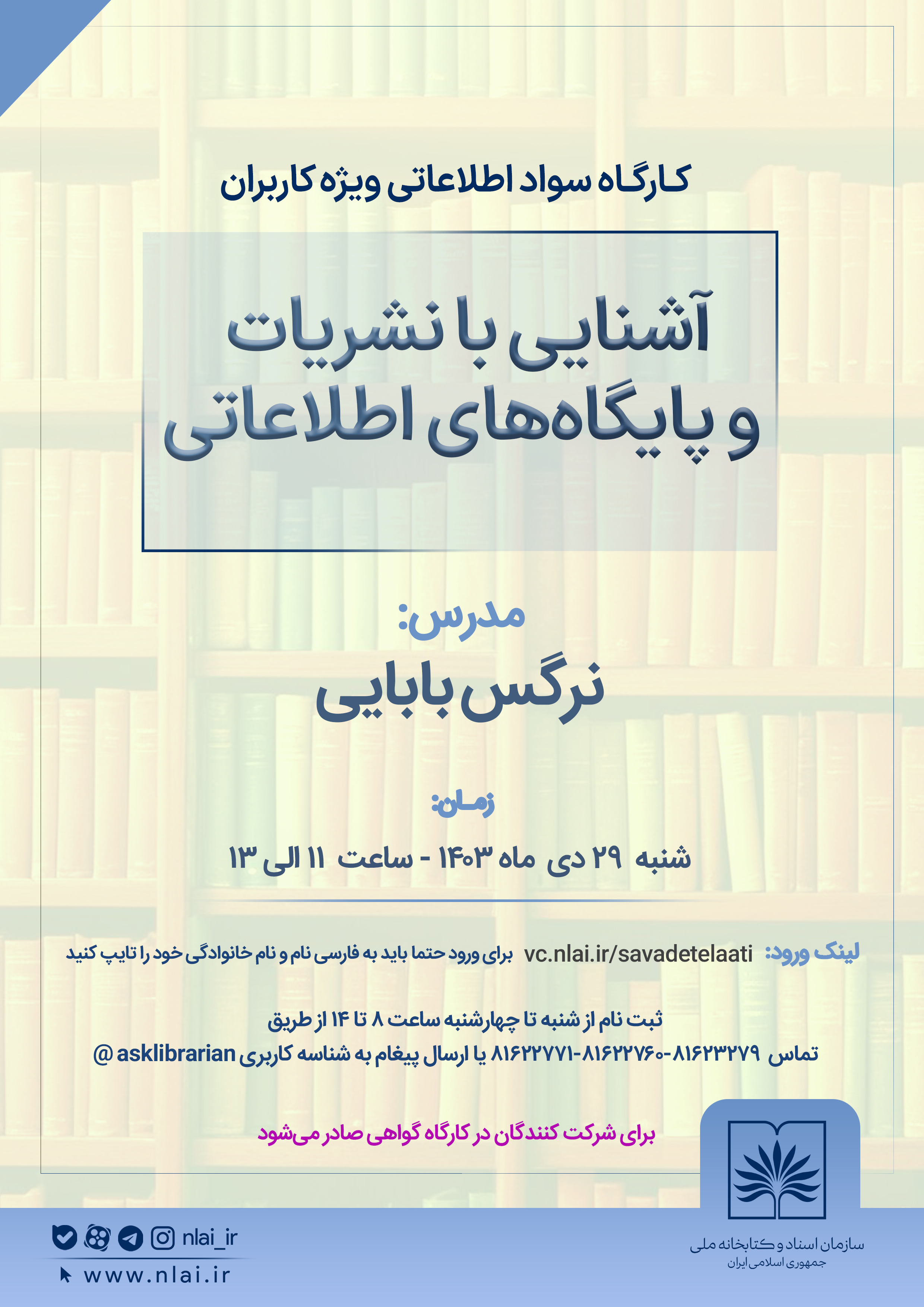 سازمان اسناد و کتابخانه ملی ایران کارگاه آنلاین سواد اطلاعاتی با موضوع آشنایی با نشریات و پایگاههای اطلاعاتی برگزار میکند.