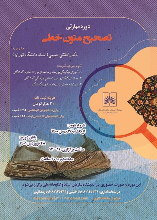به گزارش روابط عمومی سازمان اسناد و کتابخانه ملی ایران،کارگاه تخصصی «تصحیح متون خطی» با تدریس نجفقلی حبیبی مصحح متون خطی و استاد دانشگاه تهران، به مدت 20 ساعت در 10 جلسه برپا می شود.