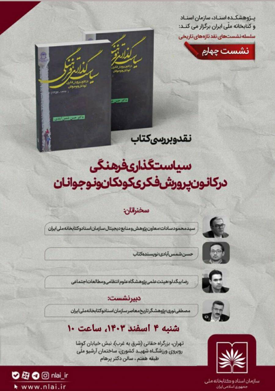 پژوهشکده اسناد سازمان اسناد و کتابخانه ملی ایران، در چهارمین نشست از سلسله نشستهای نقد تازههای تاریخی، به نقد و بررسی کتاب «سیاستگذاری فرهنگی در کانون پرورش فکری کودکان و نوجوانان» اثر حسن شمسآبادی میپردازد.