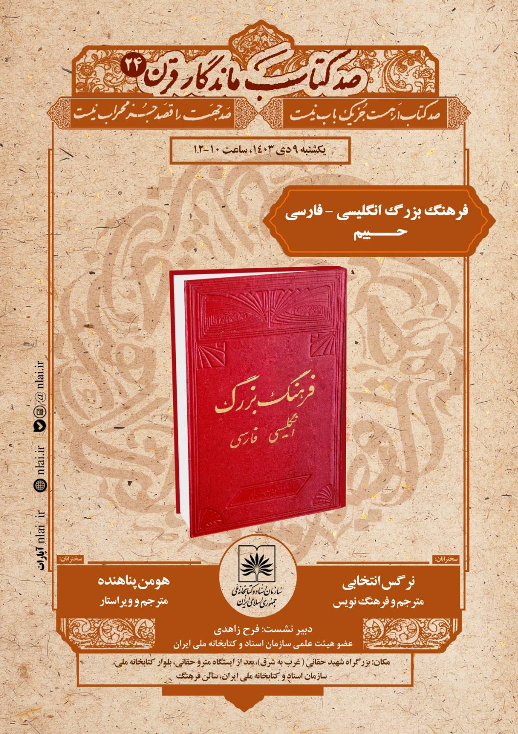 کتاب «فرهنگ بزرگ انگلیسی-فارسی» تألیف سلیمان حییم، به عنوان یکی دیگر از عناوین برگزیده در بیست و چهارمین نشست از سلسله نشستهای «صد کتاب ماندگار قرن»، در سازمان اسناد و کتابخانه ملی ایران معرفی و بررسی خواهد شد.