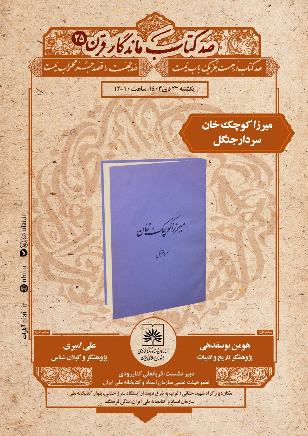 به گزارش روابط عمومی سازمان اسناد و کتابخانه ملی ایران، کتاب «میرزا کوچک خان، سردار جنگل» که بهعنوان یک اثر ماندگار درمطالعه نهضت جنگل و تحلیل شخصیت میرزا کوچک خان جنگلی، یکی از چهرههای تاریخساز و انقلابی ایران، شناخته میشود، در بیست و پنجمین نشست از سلسله نشستهای «صد کتاب ماندگار قرن» معرفی و بررسی خواهد شد.