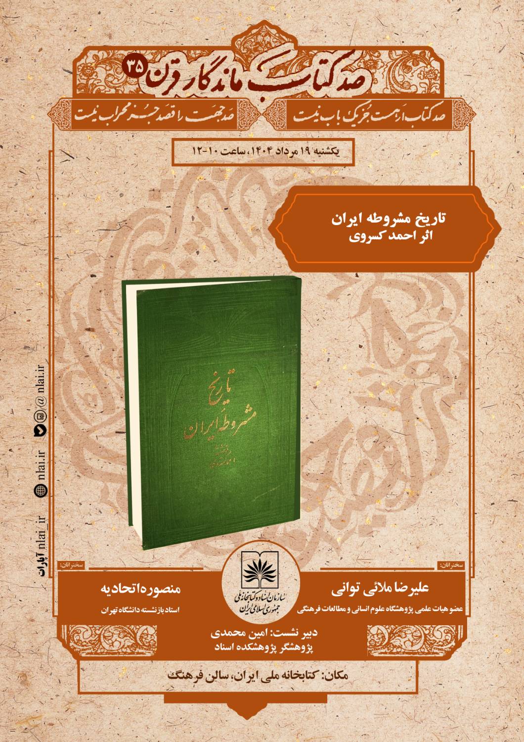 به گزارش روابط عمومی سازمان اسناد و کتابخانه ملی ایران، سی‌وپنجمین نشست از سلسله‌ رویدادهای «صد کتاب ماندگار قرن» با محوریت بررسی کتاب تاریخ مشروطه ایران اثر احمد کسروی برگزار می‌شود.
