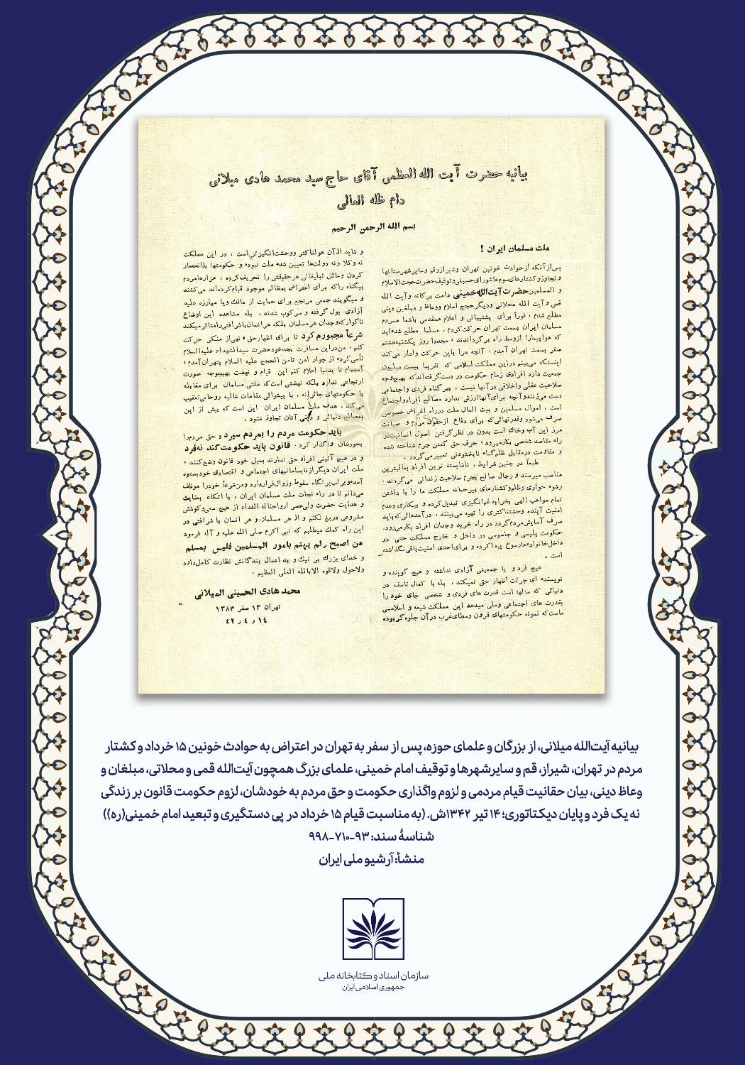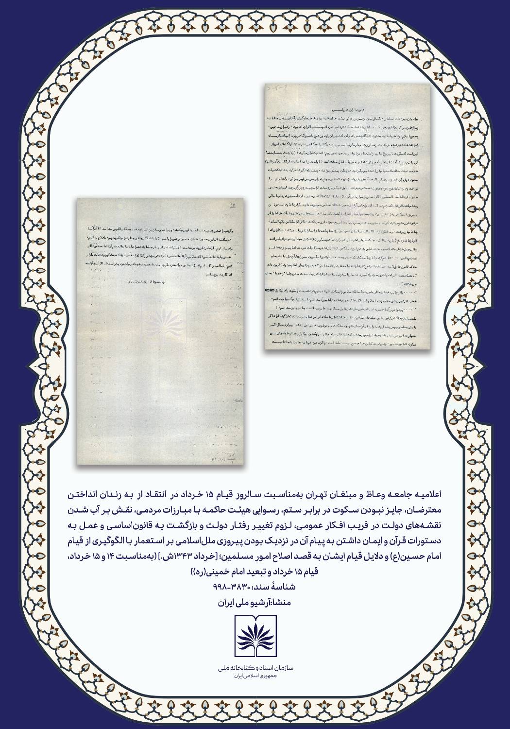اسناد تاریخی قیام 15 خرداد از آرشیو ملی ایران در وبسایت سازمان اسناد و کتابخانه ملی به نشانی www.nlai.ir و شبکه های اجتماعی این سازمان در نشانی nlai_ir@ در استرس علاقه مندان است.