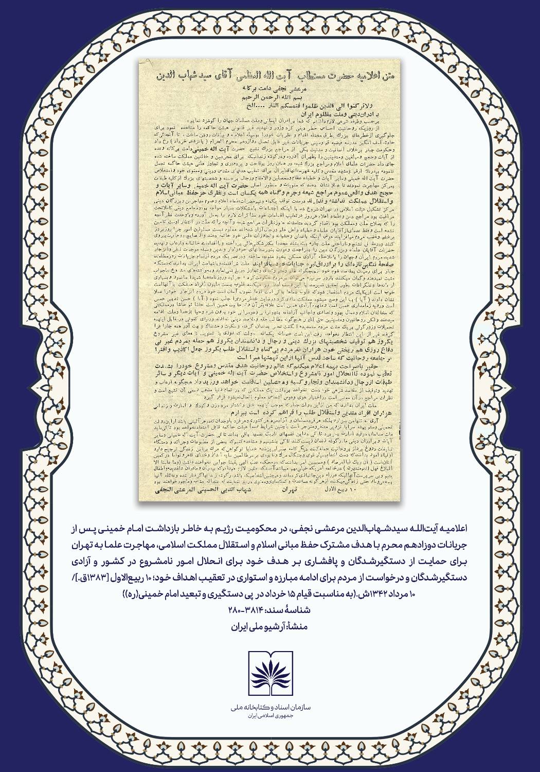 به گزارش روابط عمومی سازمان اسناد و کتابخانه ملی ایران، اسناد فوق از منابع موجود در آرشیو ملی ایران است و محوریت آن، حمایت سایر علما و روحانیون از این قیام و محکوم کردن کشتار و سرکوب مردم در این دوره حساس تاریخی است.