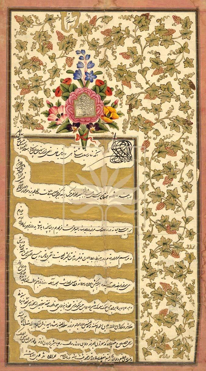 «مستوفیان عظام دیوان اعلی رقم این عطیه را در دفاتر خلود ثبت نمایند و در عهده شناسند.»