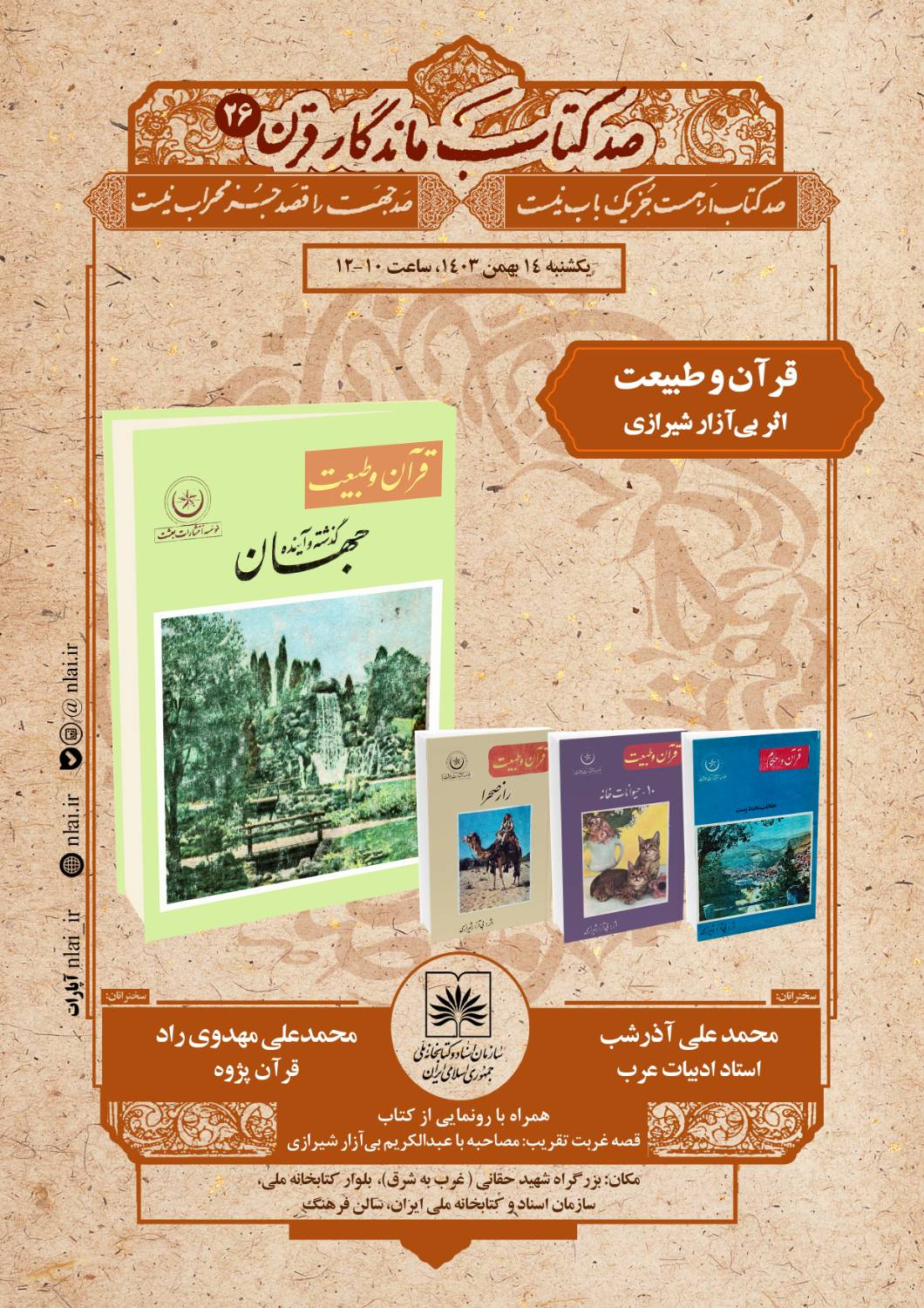 مجموعه کتاب‌های «قرآن و طبیعت » تألیف عبدالکریم بی‌آزار شیرازی، به‌عنوان یکی دیگر از عناوین برگزیده در بیست و ششمین نشست از سلسله نشست‌های «صد کتاب ماندگار قرن»، در سازمان اسناد و کتابخانه ملی ایران بررسی می‌شود. در همین نشست، از کتاب «قصه غربت تقریب»، که به همت غلامرضا امیرخانی تهیه شده است، رونمایی خواهد شد.