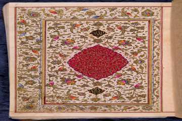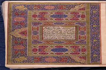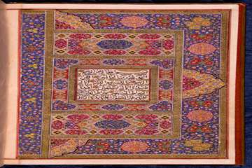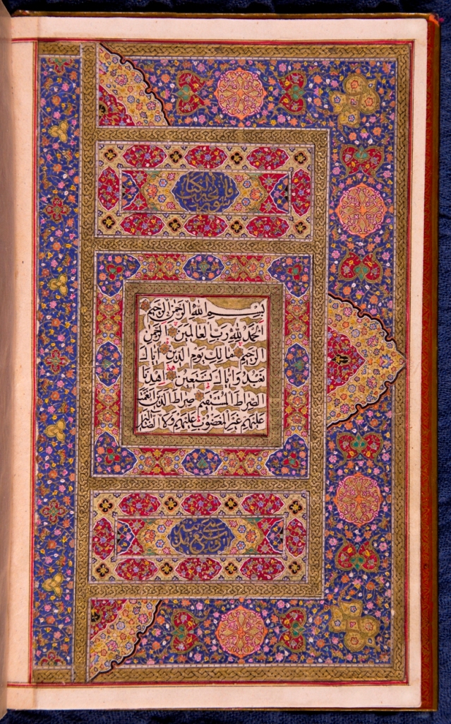 دو صفحه نخست قرآن تمام تذهیب با دعای قبل از تلاوت قرآن که در دو ترنج زمینه سرخ وسط به زر نوشته شده است. دو صفحه افتتاحیه قرآن کاملا مذهب و مرصع بسیار نفیس با چهار کتیبه در صدر و ذیل و نقوش پرکار فاخر.